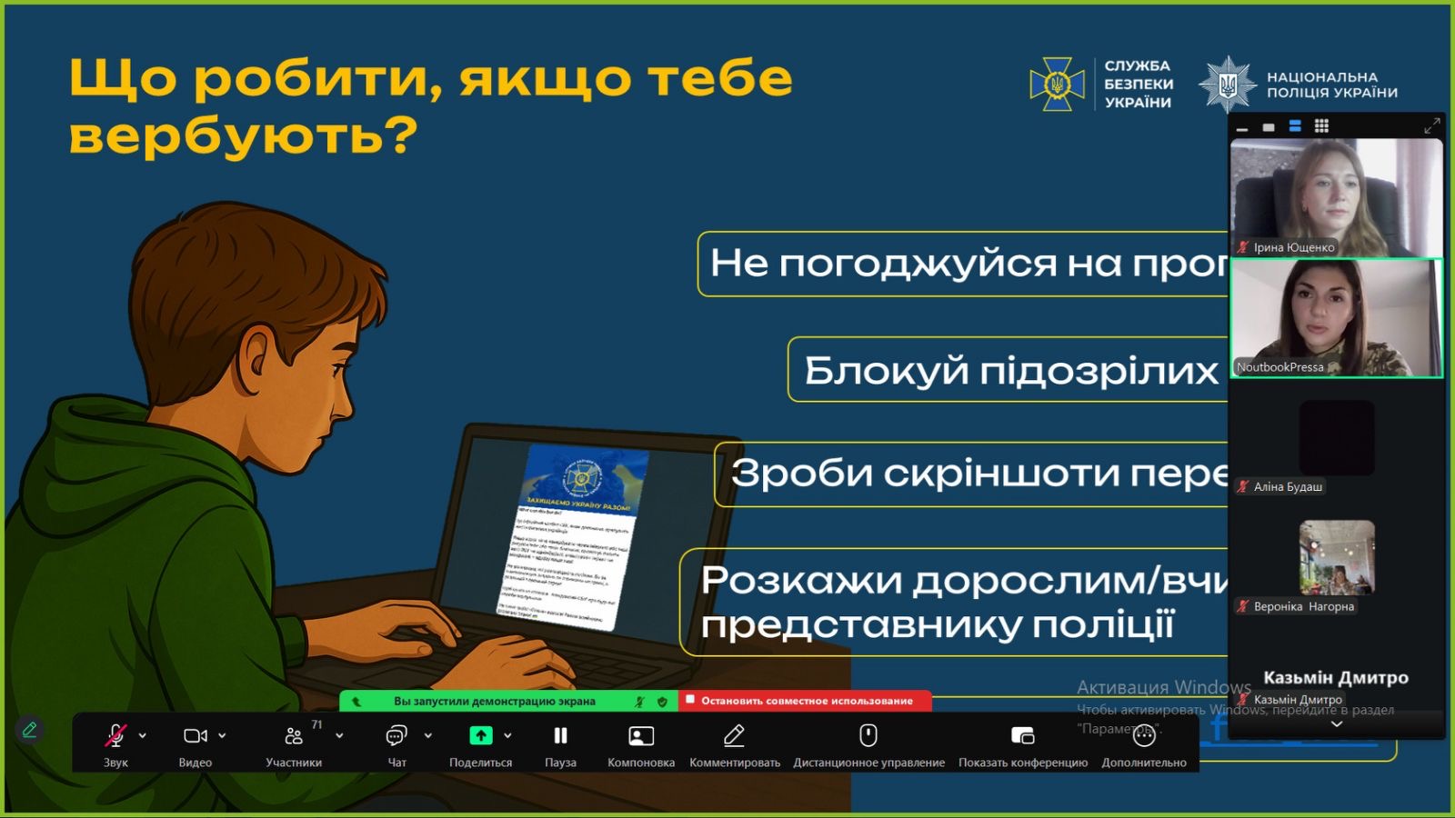 Також були надані поради щодо захисту в інтернеті: не спілкуватися з незнайомцями, не надавати особисту інформацію, не піддаватися на шантаж та перевіряти факти. Головні висновки заходу полягали в необхідності не піддаватися на маніпуляції та не мовчати, оскільки вербування є злочином і своєчасне повідомлення може врятувати життя.