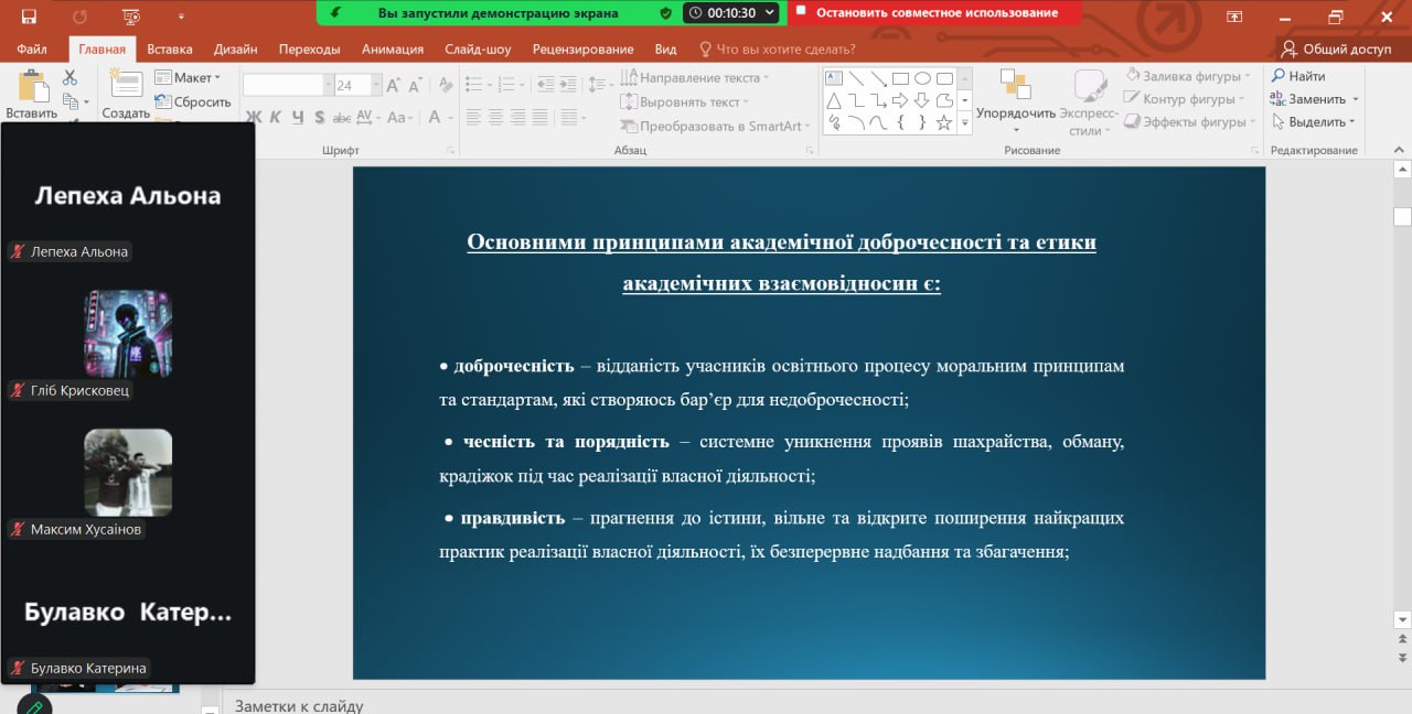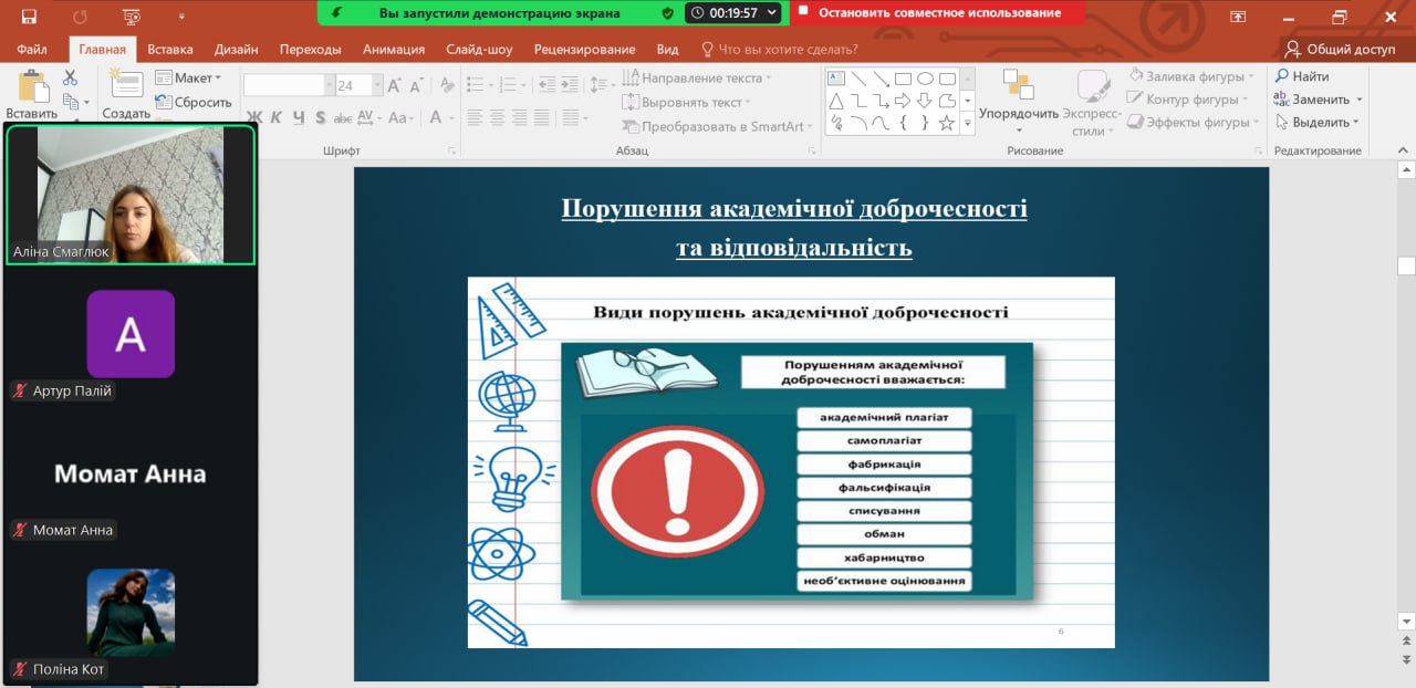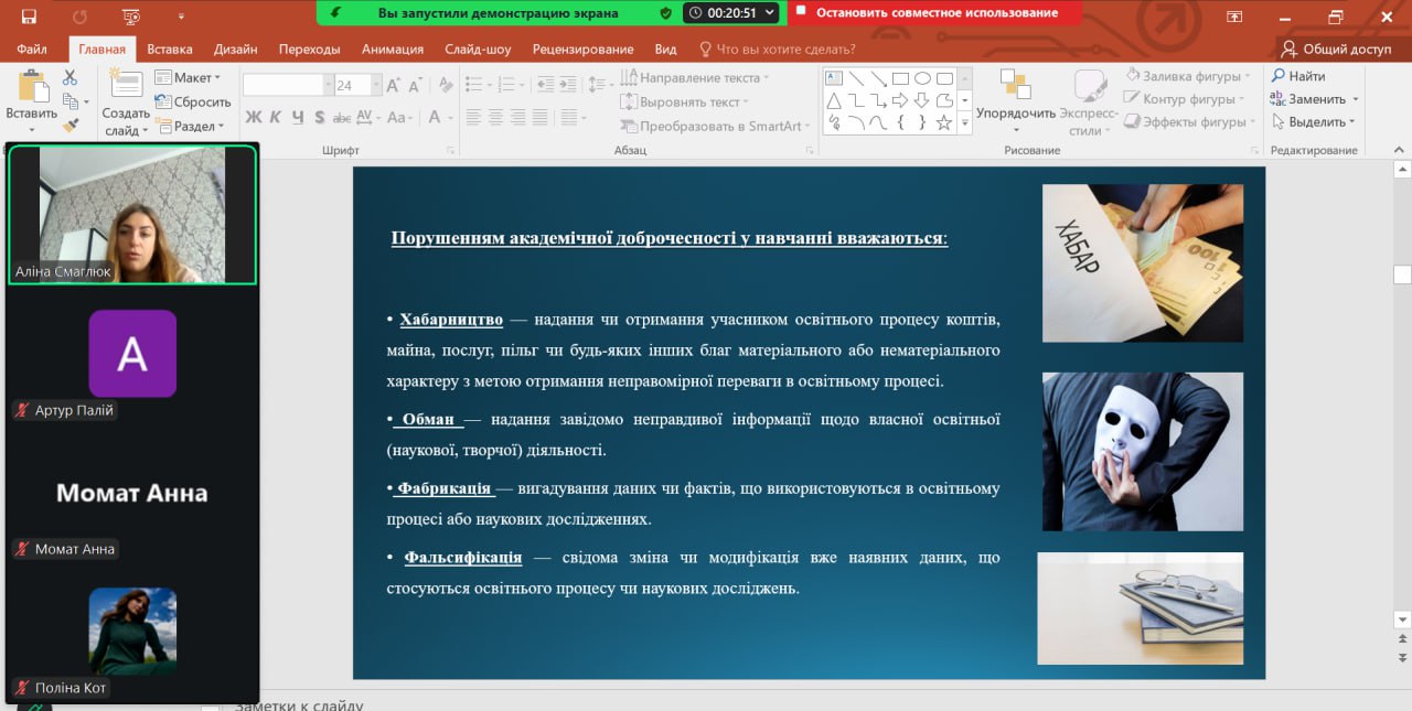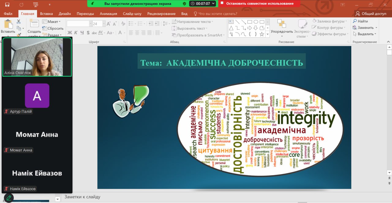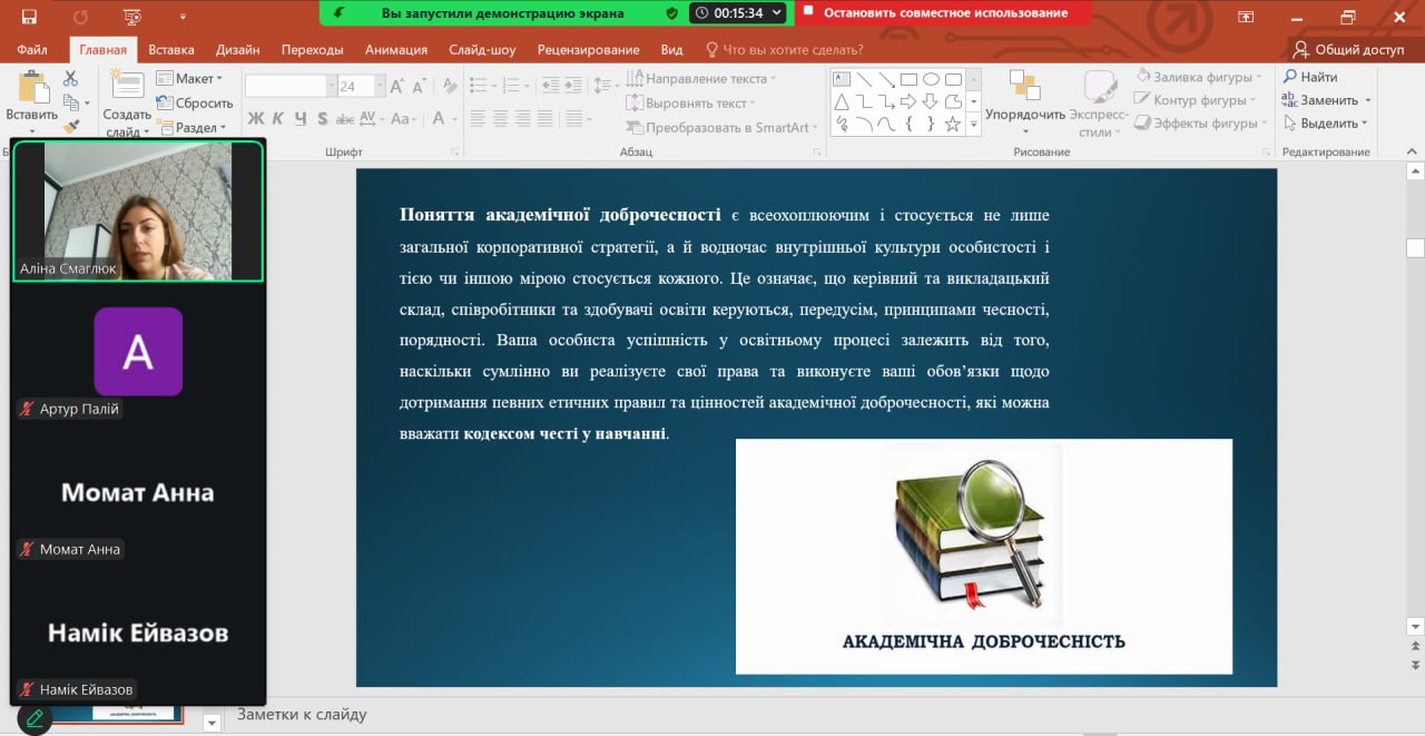 Куратор А. Смаглюк розповіла про основні принципи доброчесності у освітньому процесі, види порушень — від плагіату до хабарництва — та пояснила, чому важливо дотримуватися етичних норм у будь якій освітній діяльності 💬📚
