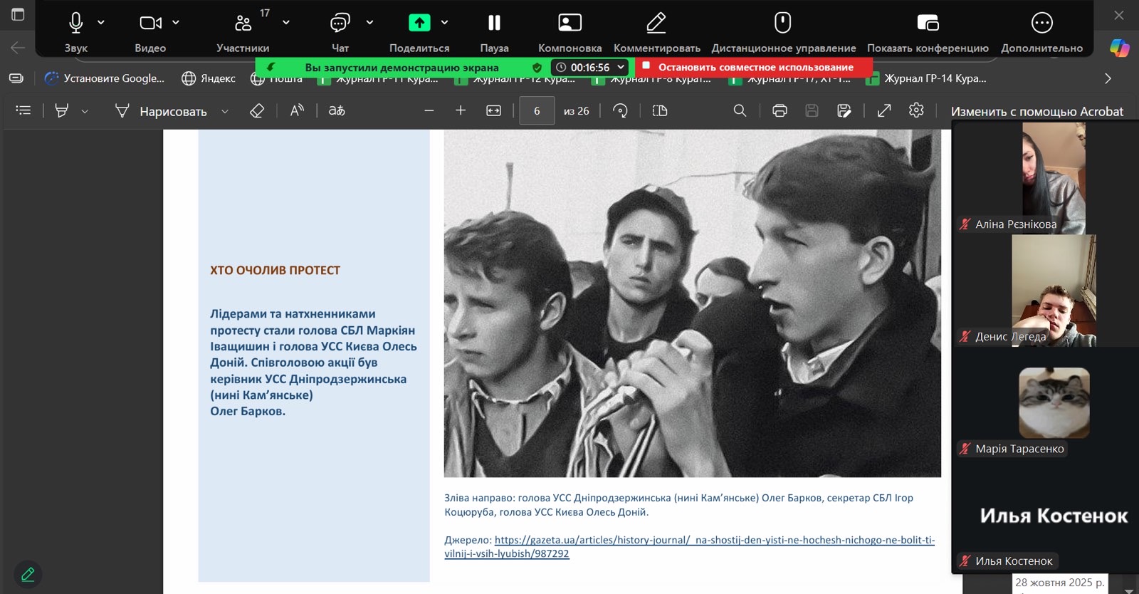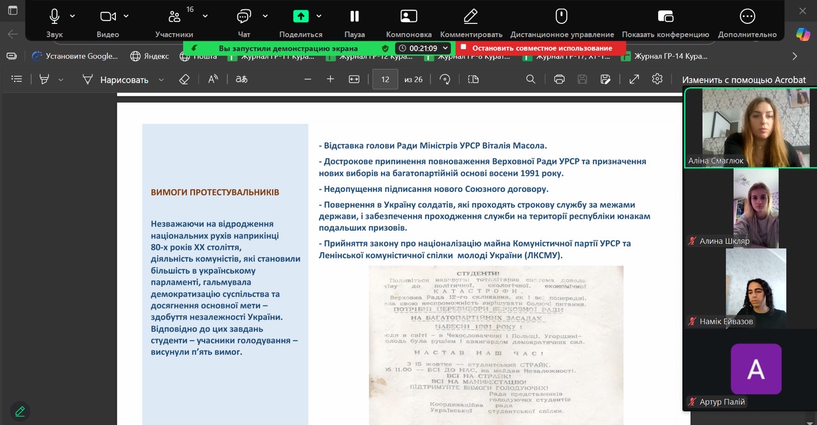 28 жовтня 2025 року викладач Аліна СМАГЛЮК провела для здобувачів фахової передвищої освіти академічних груп ГР-17 та ХТ-14 пізнавальну кураторську годину, присвячену 35-річчю Революції на граніті.