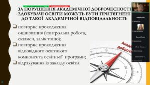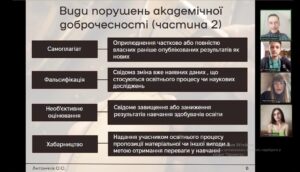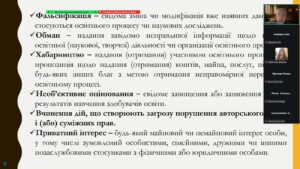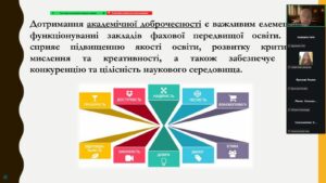 Під час занять розглядалися ключові поняття академічної доброчесності, види академічних порушень, шляхи їх запобігання та роль кожного учасника освітнього процесу у забезпеченні якості освіти. Виховні години сприяли розвитку ціннісних орієнтацій студентської молоді, формуванню критичного мислення та усвідомленої позиції щодо дотримання етичних стандартів у навчанні й професійній діяльності.