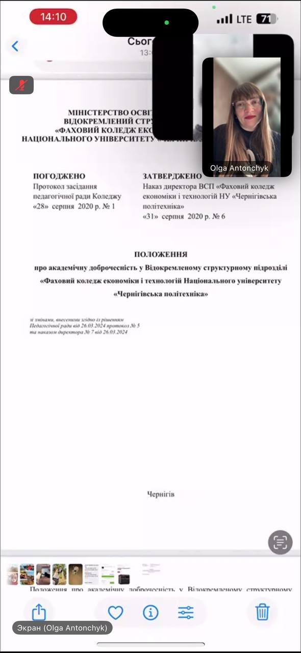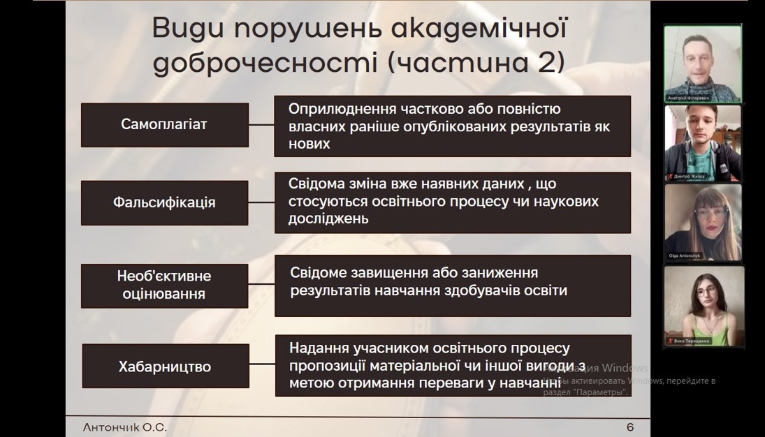 Разом із куратором здобувачі освіти обговорили основні цінності академічної доброчесності та дійшли висновку, що чесність, справедливість, прозорість, повага, відповідальність, сміливість і довіра під час навчання сприяють кращому засвоєнню знань.