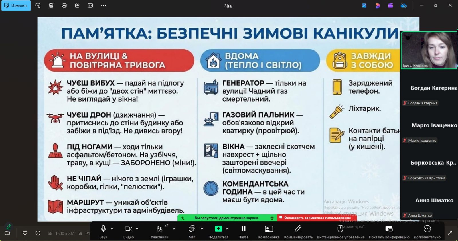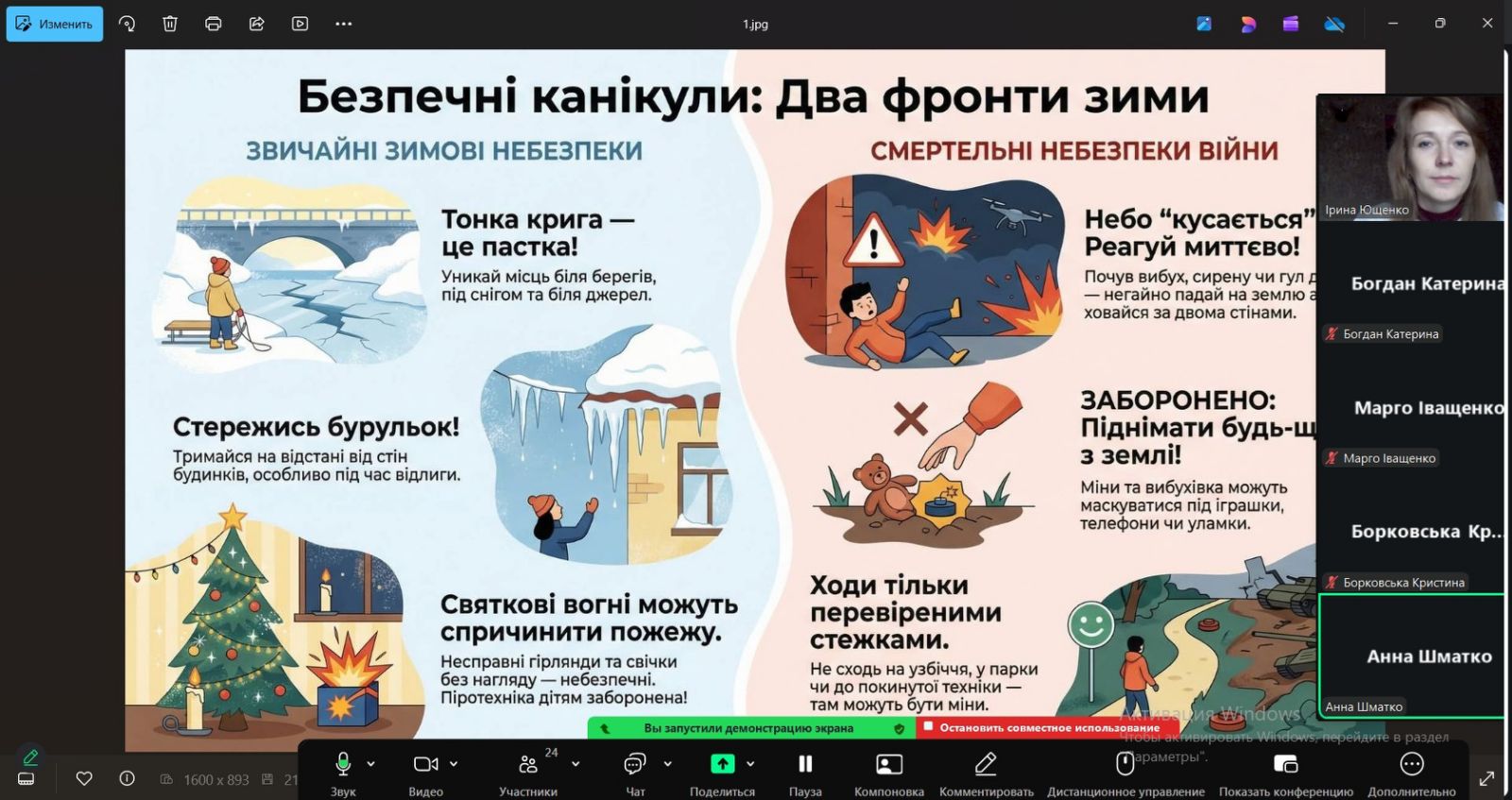 Для здобувачів освіти ОПП Право групи ПР-21 була проведена виховна година на тему «Безпечні зимові канікули: Твої правила життя». Метою заходу було поглибити знання здобувачів освіти про зимові небезпеки та, що особливо важливо, про правила поводження в умовах воєнного часу.