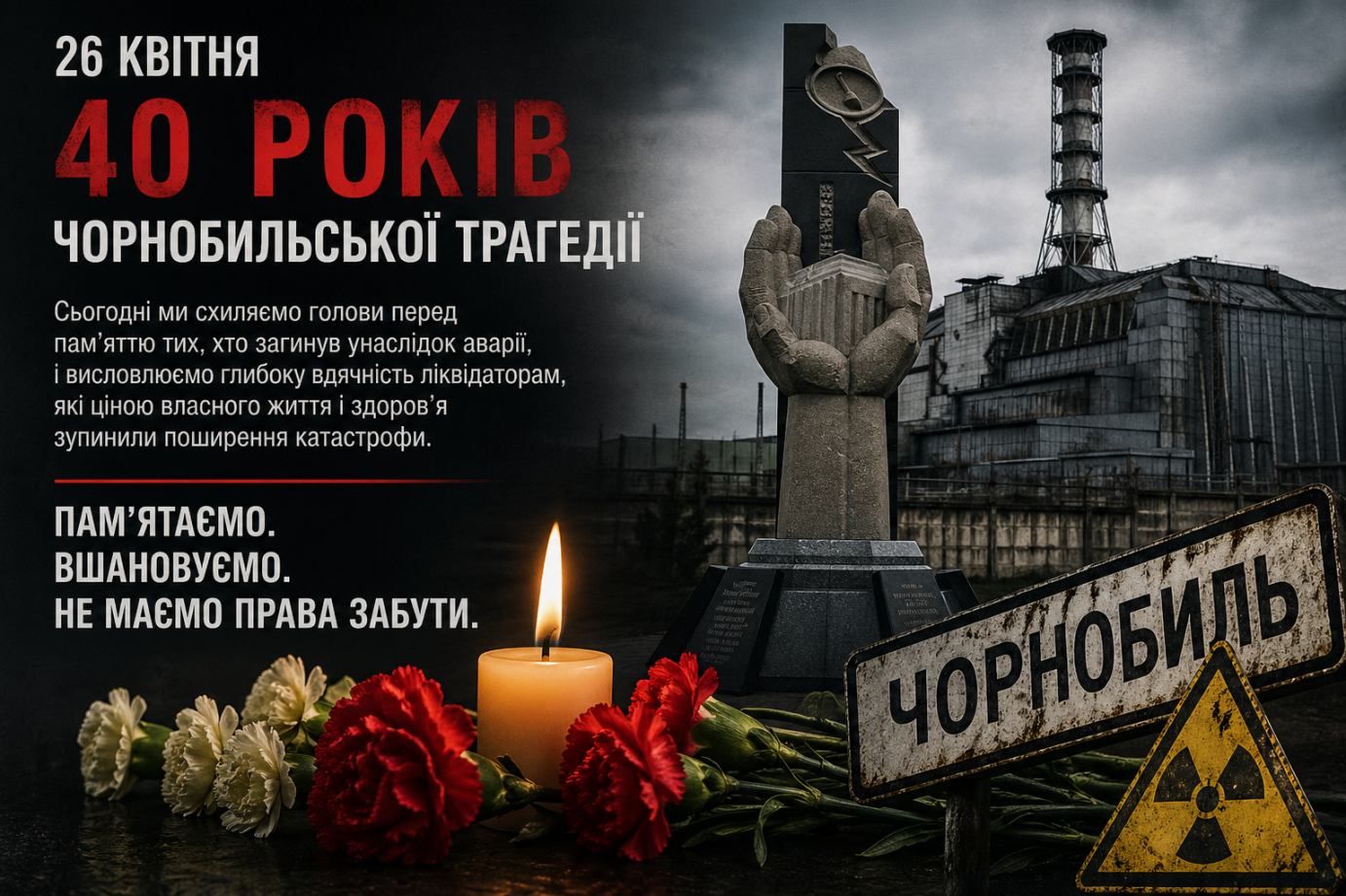 26 квітня 1986 року назавжди змінило долі тисяч людей, стало болючим уроком для всього світу та нагадуванням про відповідальність людини за свої дії. Ми схиляємо голови перед пам’яттю тих, хто загинув унаслідок аварії, і висловлюємо глибоку вдячність ліквідаторам, які ціною власного життя і здоров’я зупинили поширення катастрофи.