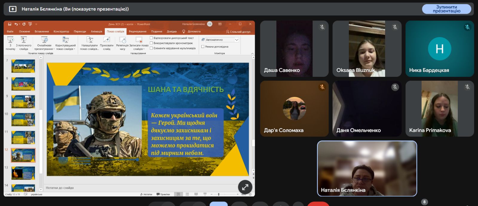 Метою заходу, організованого куратором групи Бєлянкіною Н., стало формування глибокої поваги до захисників, які стоять на варті незалежності та територіальної цілісності нашої держави.