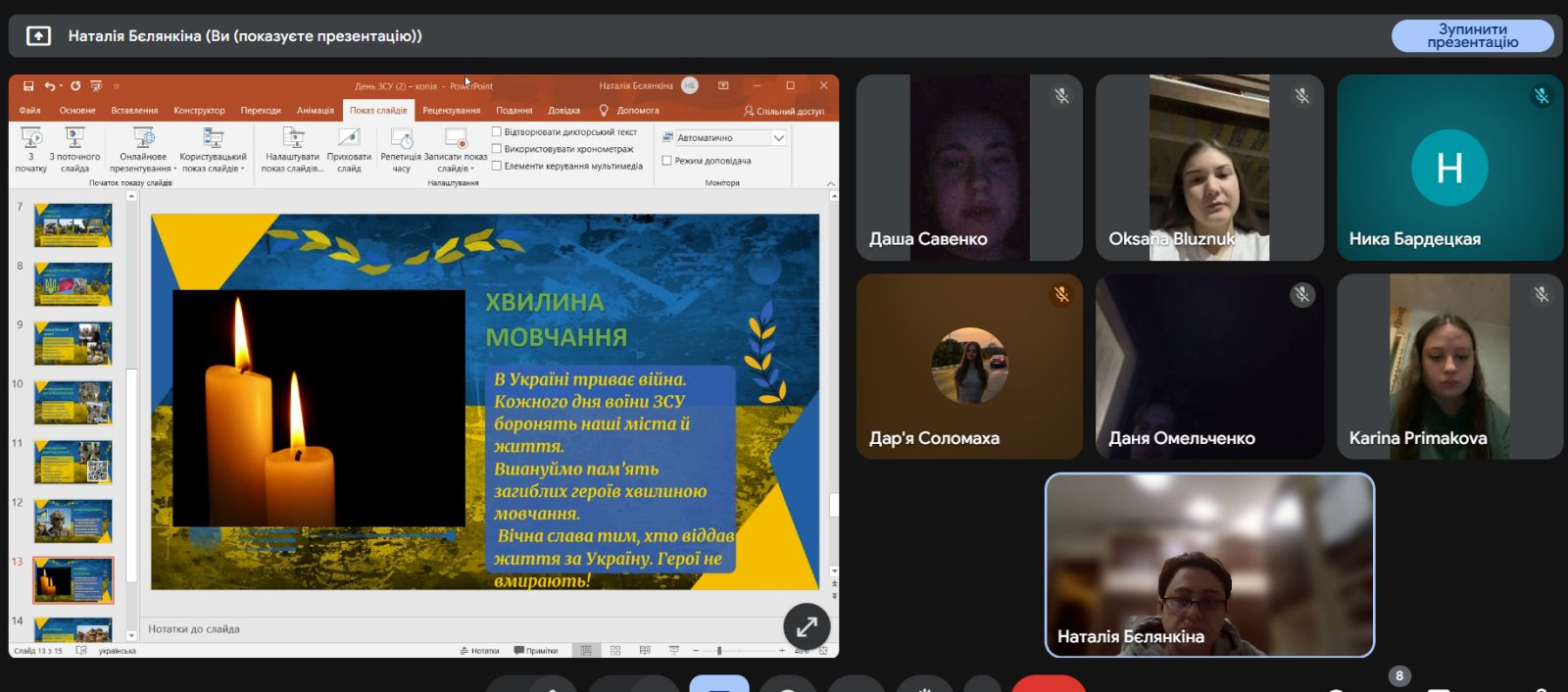 Здобувачі освіти обговорили історичні етапи становлення ЗСУ, проаналізували приклади сучасної незламності та ознайомилися з родами військ. Захід завершився висловленням щирої вдячності військовим Хвилиною мовчання.