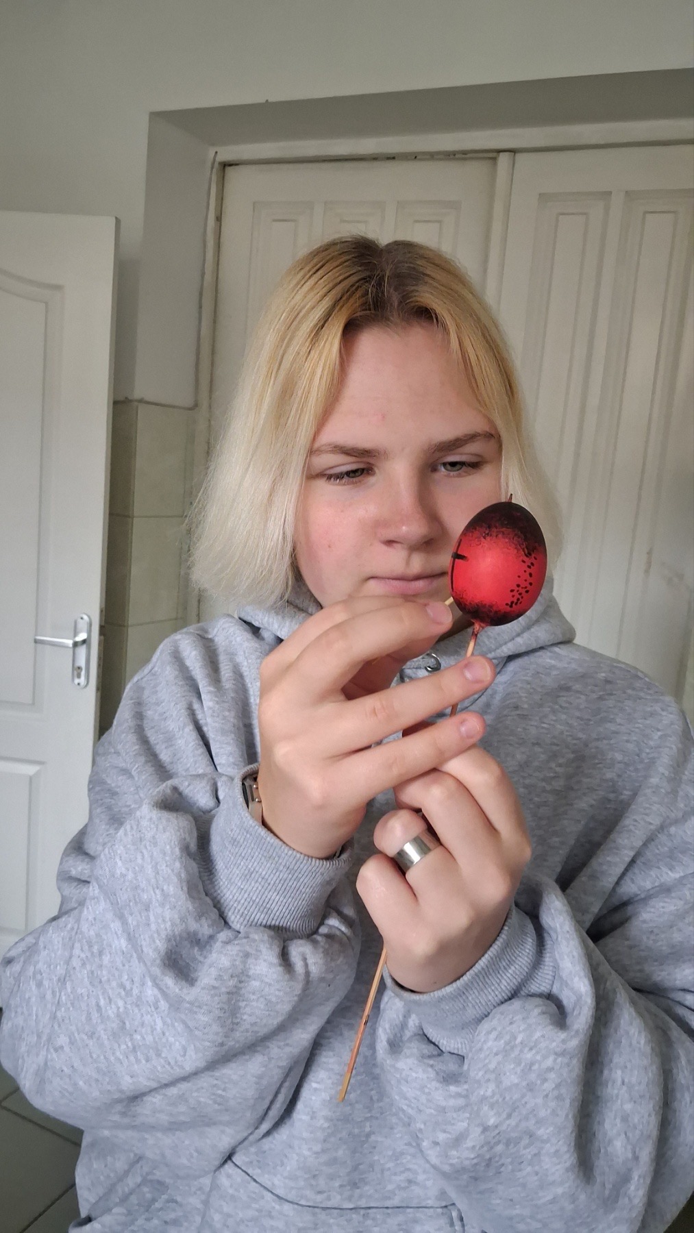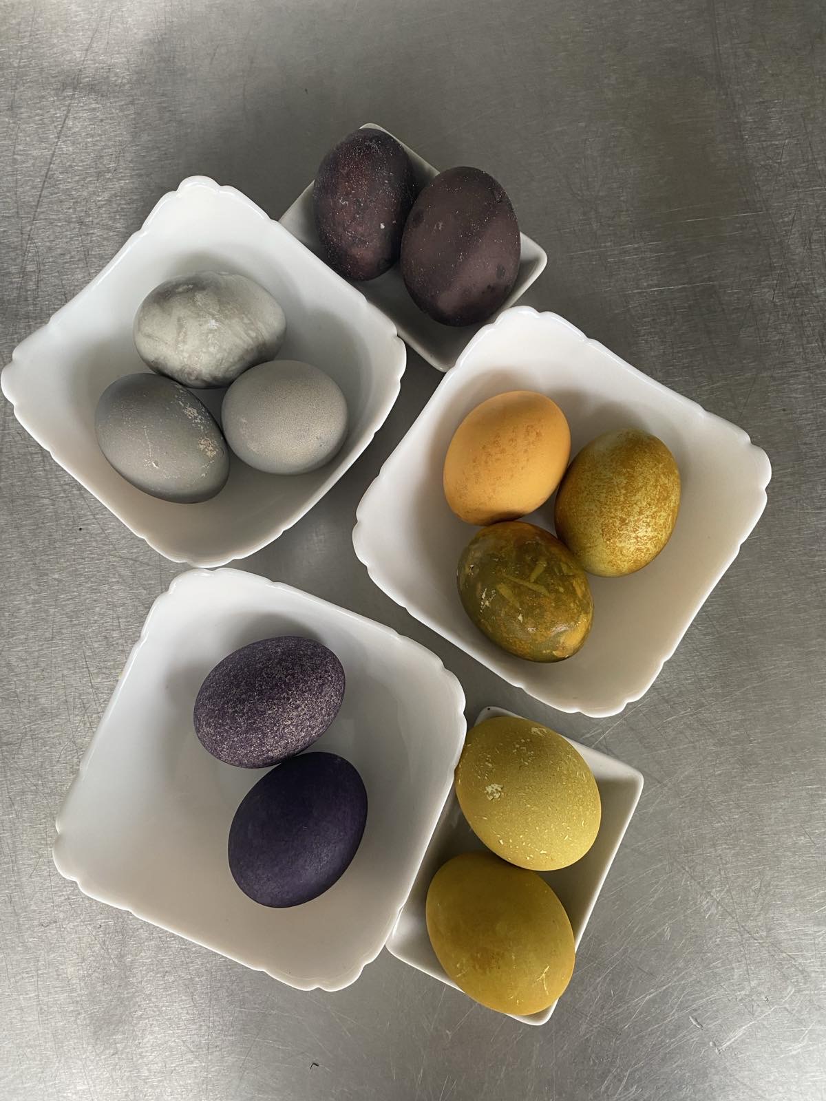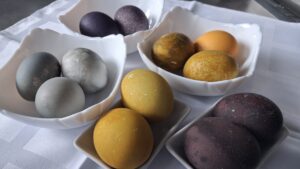 Після теоретичної частини розпочалася справжня магія експерименту. Під керівництвом викладачів здобувачі освіти випробовували силу природних барвників, відмовившись від будь-яких штучних пігментів на користь натуральних продуктів. Куркума дарувала яйцям сонячно-золоті відтінки, а червоне вино створювало глибокі мерехтливі кольори з ефектом кристалізації. Чай каркаде дивував палітрою від ніжно-сірого до насиченого космічного синього, а відвар червоної капусти давав неймовірні небесні відтінки.