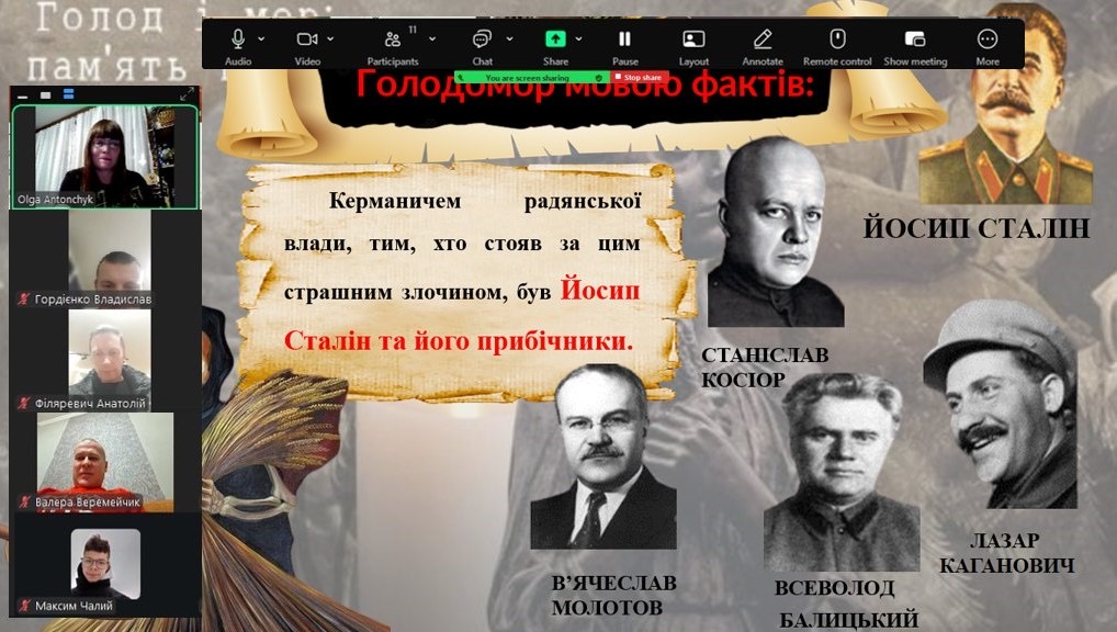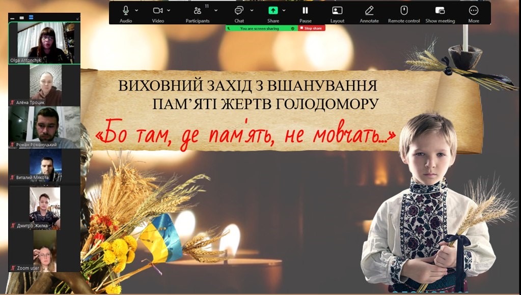 20 листопада для студентів першого курсу групи Т-13 відбулася кураторська година присвячена темі Голодомору та його наслідків. В ході даного заходу здобувачі освіти разом з куратором вшанували пам’ять мільйонів жертв масових штучних голодів 1921-23, 1932-33 та 1946-47 років та пригадали, основні історичні передумови, причини та наслідки злочину радянської влади проти українців. Оскільки у 2006 році Законом України Голодомор був визнаний геноцидом Українського народу, здобувачі разом з куратором домовились незалежно від місця знаходження 22 листопада о 16 год. запалити свічку пам’яті та вшанувати хвилиною мовчання жертв злочину радянського режиму. Кураторську годину провела викладач Антончик О.С.