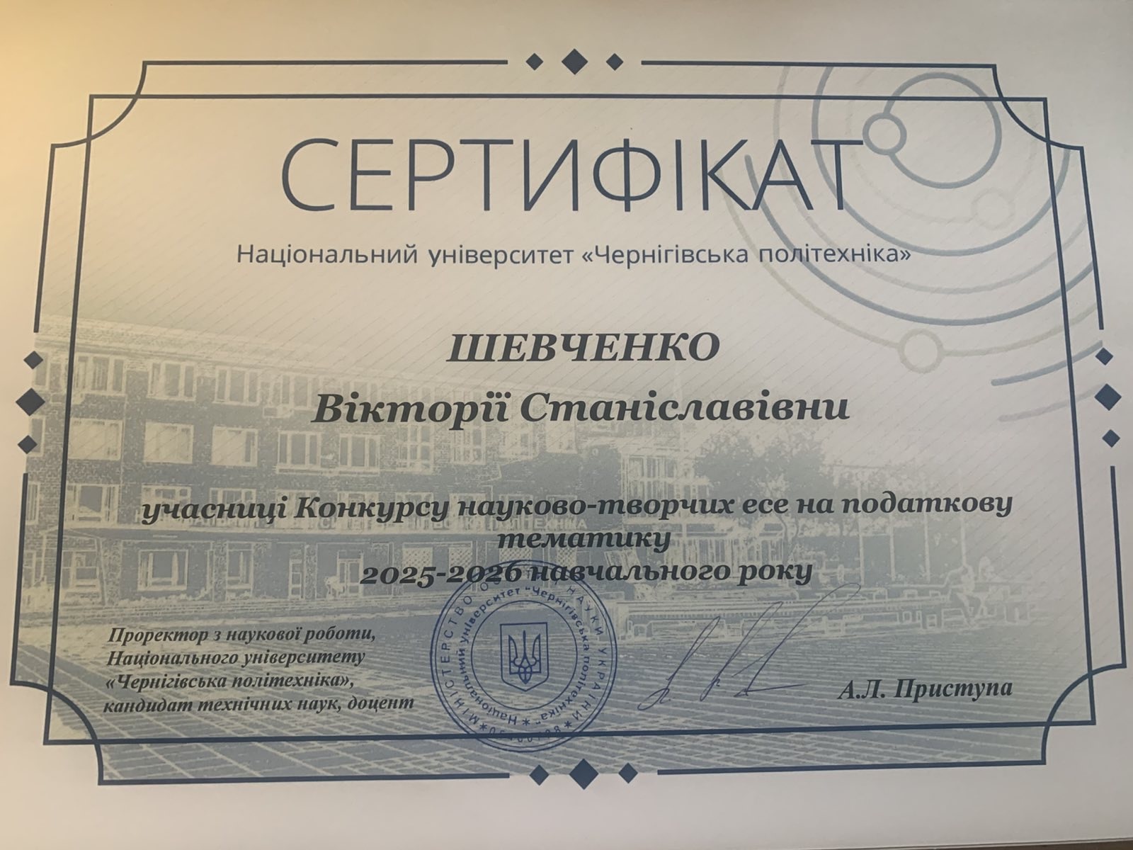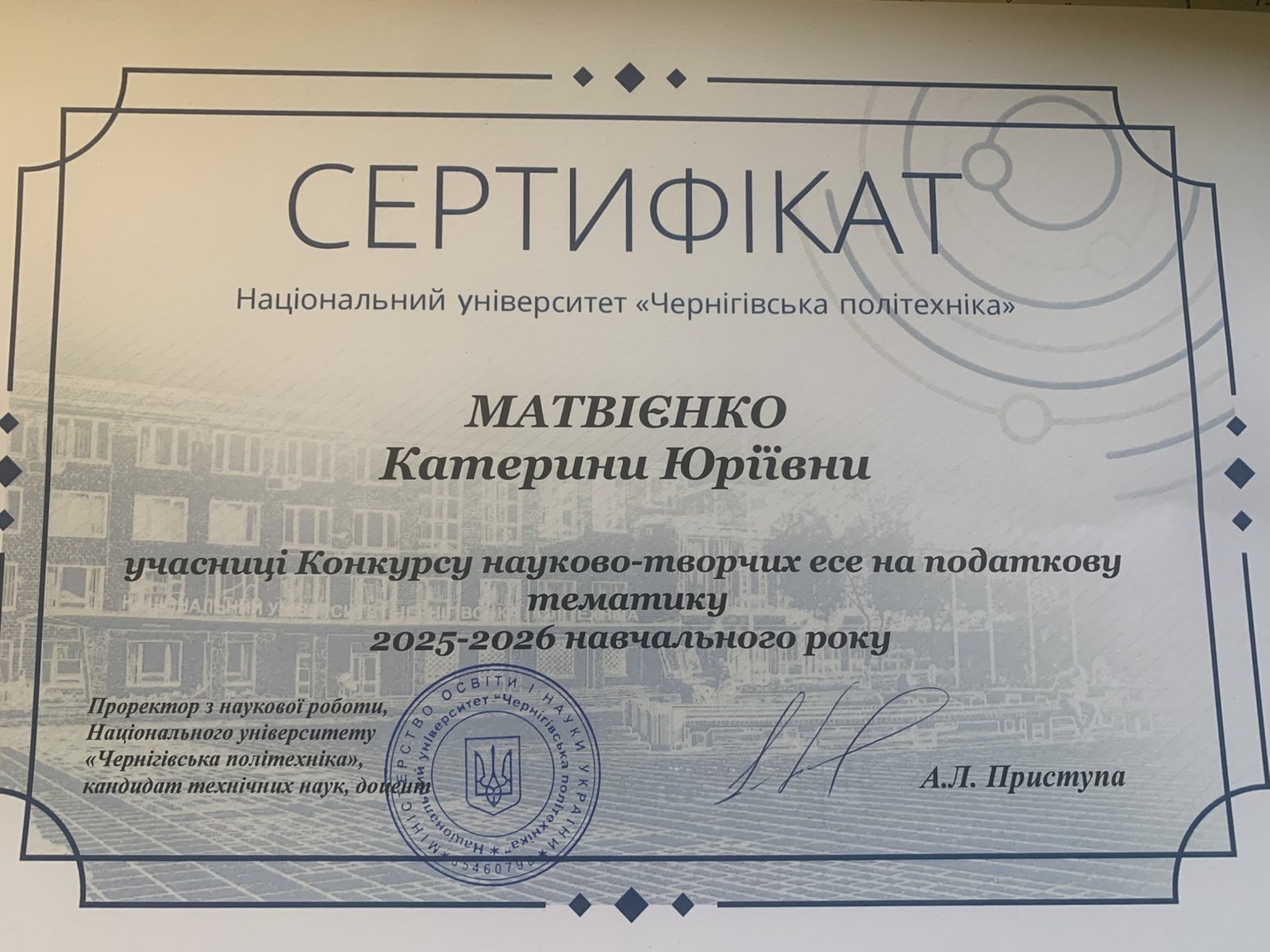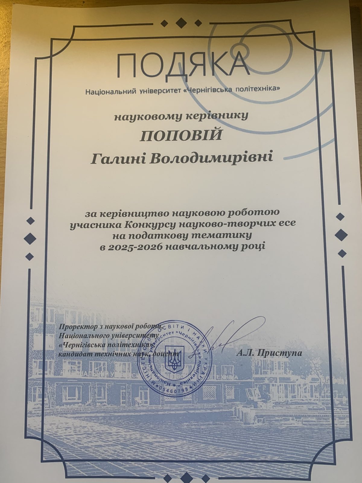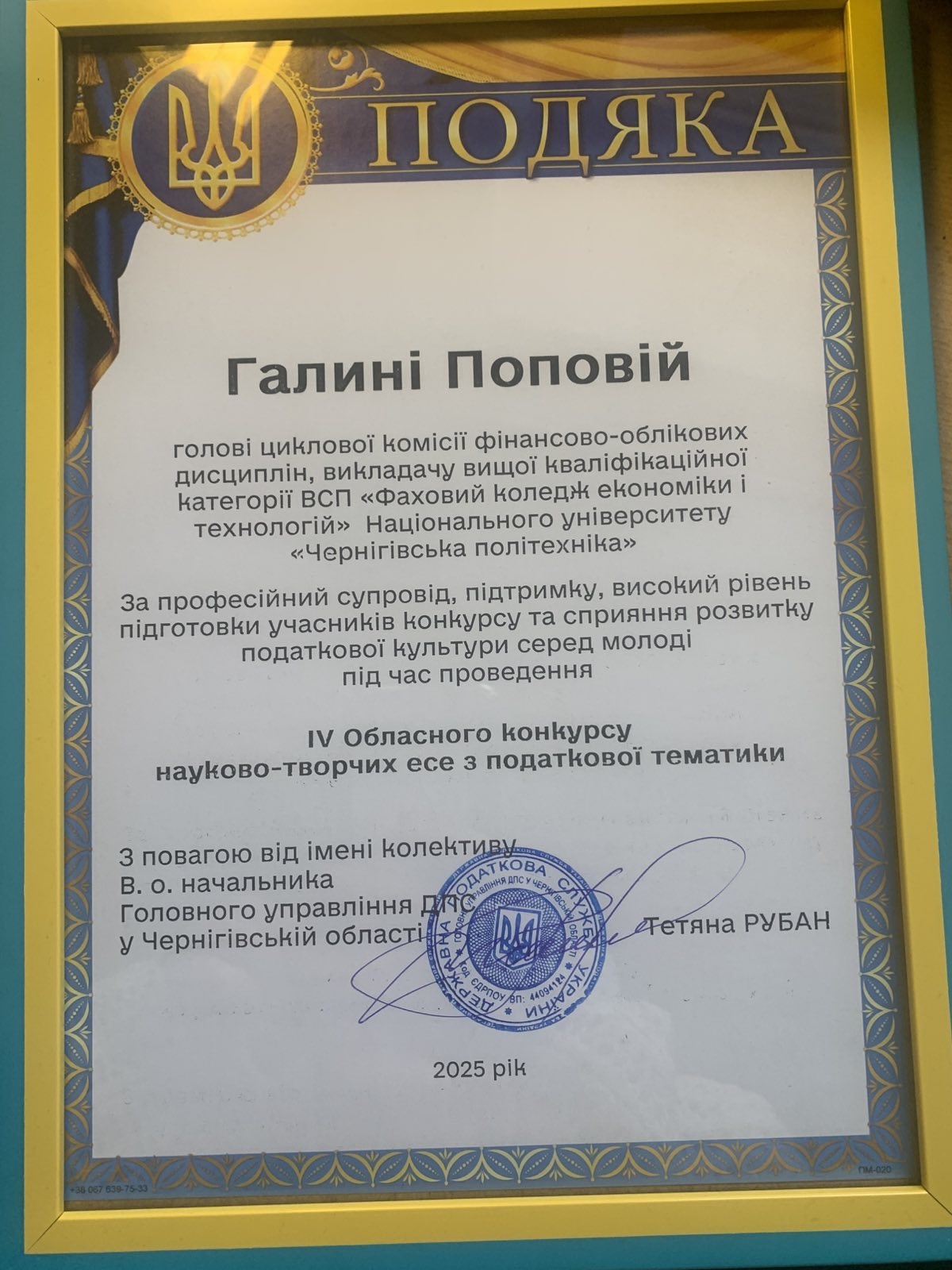 10 грудня 2025 року викладачі Галина ПОПОВА, Вікторія ПЕТРОВСЬКА та здобувачі груп Т-12, ЕП-12, ЕП-13, ФБ-11, ФБ-12 у стінах Головного управління ДПС у Чернігівській області під час Форуму “Наскрізь”: чесний погляд молоді на податки відбулося урочисте нагородження переможців та учасників ІV Обласного конкурсу науково-творчих есе на податкову тематику, який організовує кафедра економіки, обліку і оподаткування Національного університету «Чернігівська політехніка».