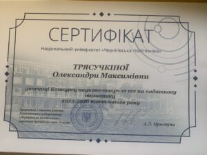 8. Трясучкіна Олександра, сертифікат учасниці конкурсу