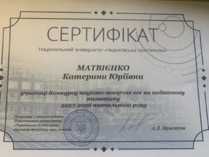 6. Матвієнко Катерина, сертифікат учасниці конкурсу