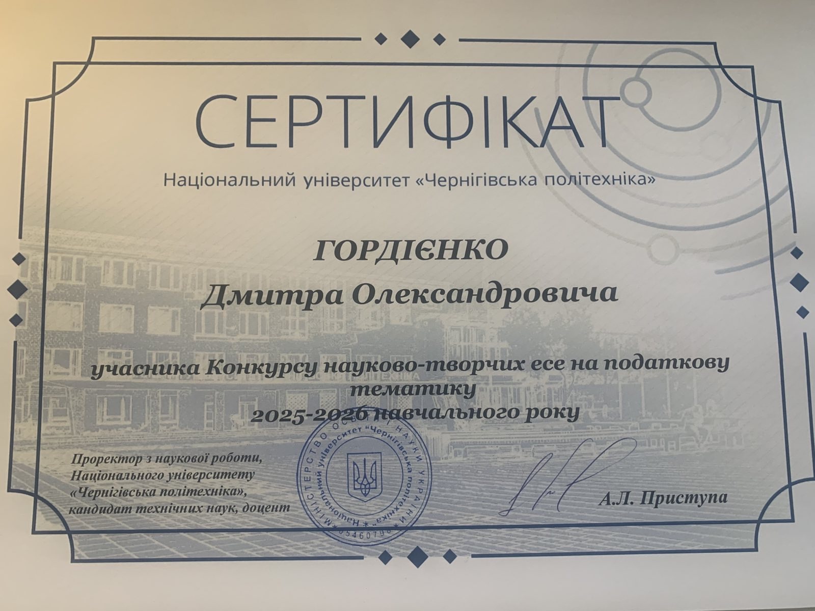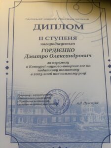 2. Гордієнко Дмитро, диплом ІІ ступеня та сертифікат учасниці конкурсу