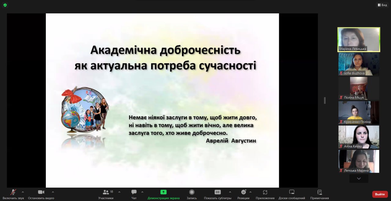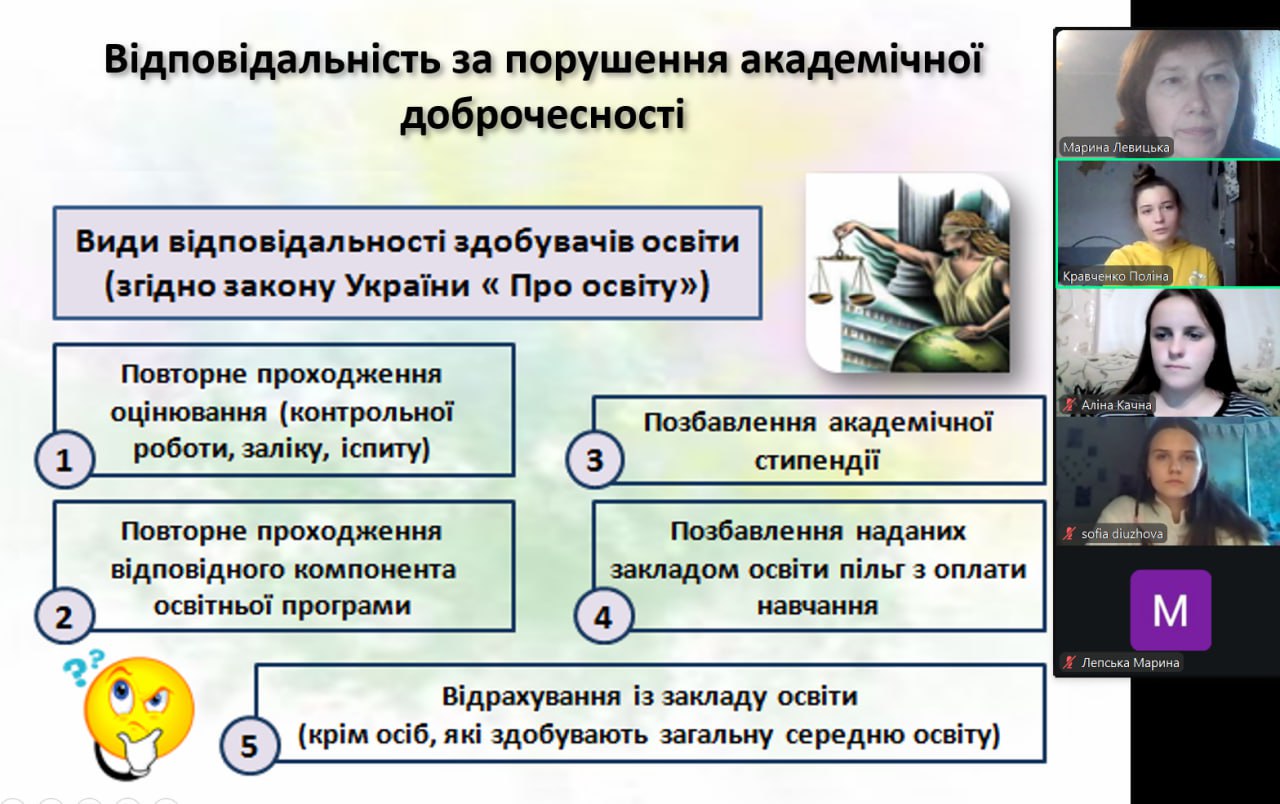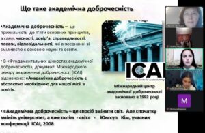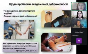 Під час спілкування викладач наголосила на основних принципах академічної доброчесності: недопустимості плагіату, списування, фабрикації та фальсифікації результатів. Особливу увагу було приділено питанню самостійного виконання завдань і відповідальності кожного здобувача освіти за власний результат.