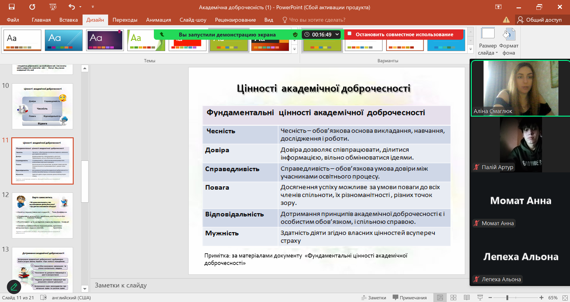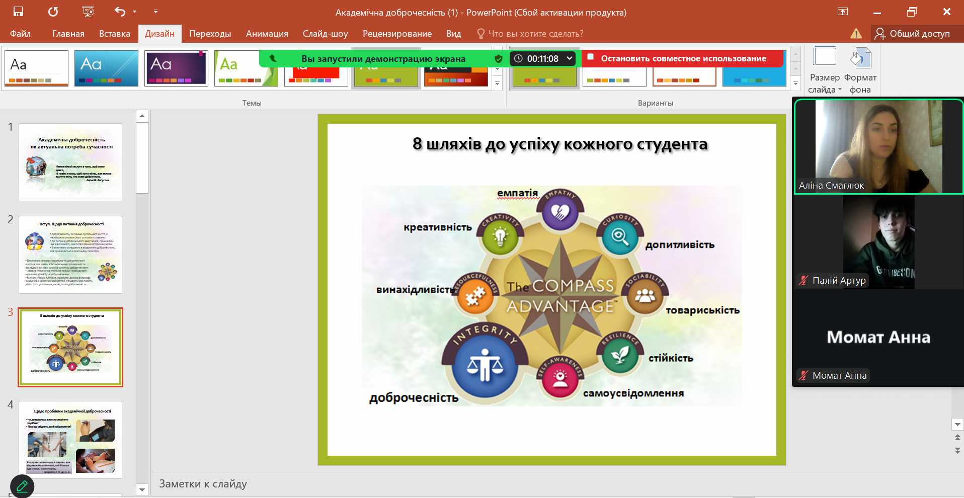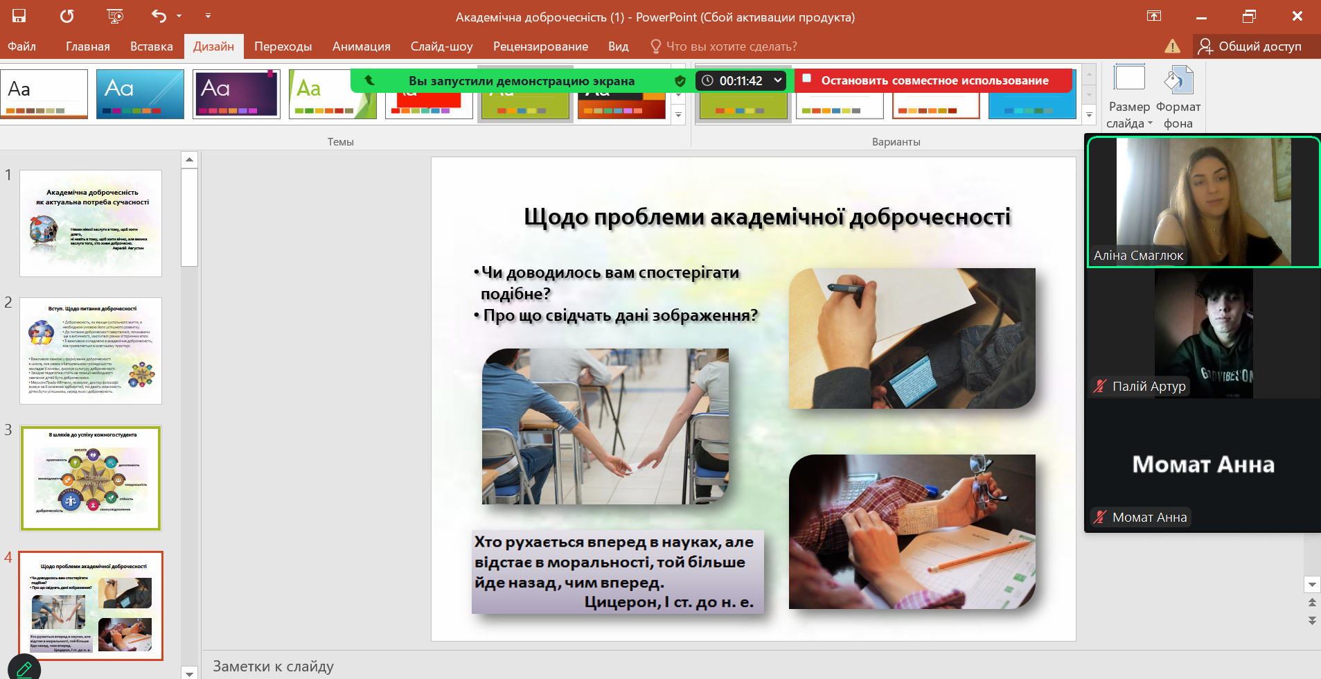Під час кураторської години здобувачі освіти мали змогу поглибити вже наявні знання про принципи академічної доброчесності, актуалізувати розуміння важливості чесності в освітньому процесі та ще раз звернути увагу на правила, яких необхідно дотримуватися під час навчання. Також було обговорено ключові цінності доброчесності та їх роль у формуванні відповідального студентського середовища.