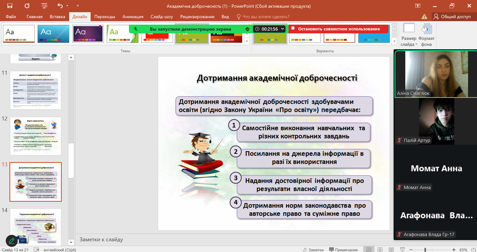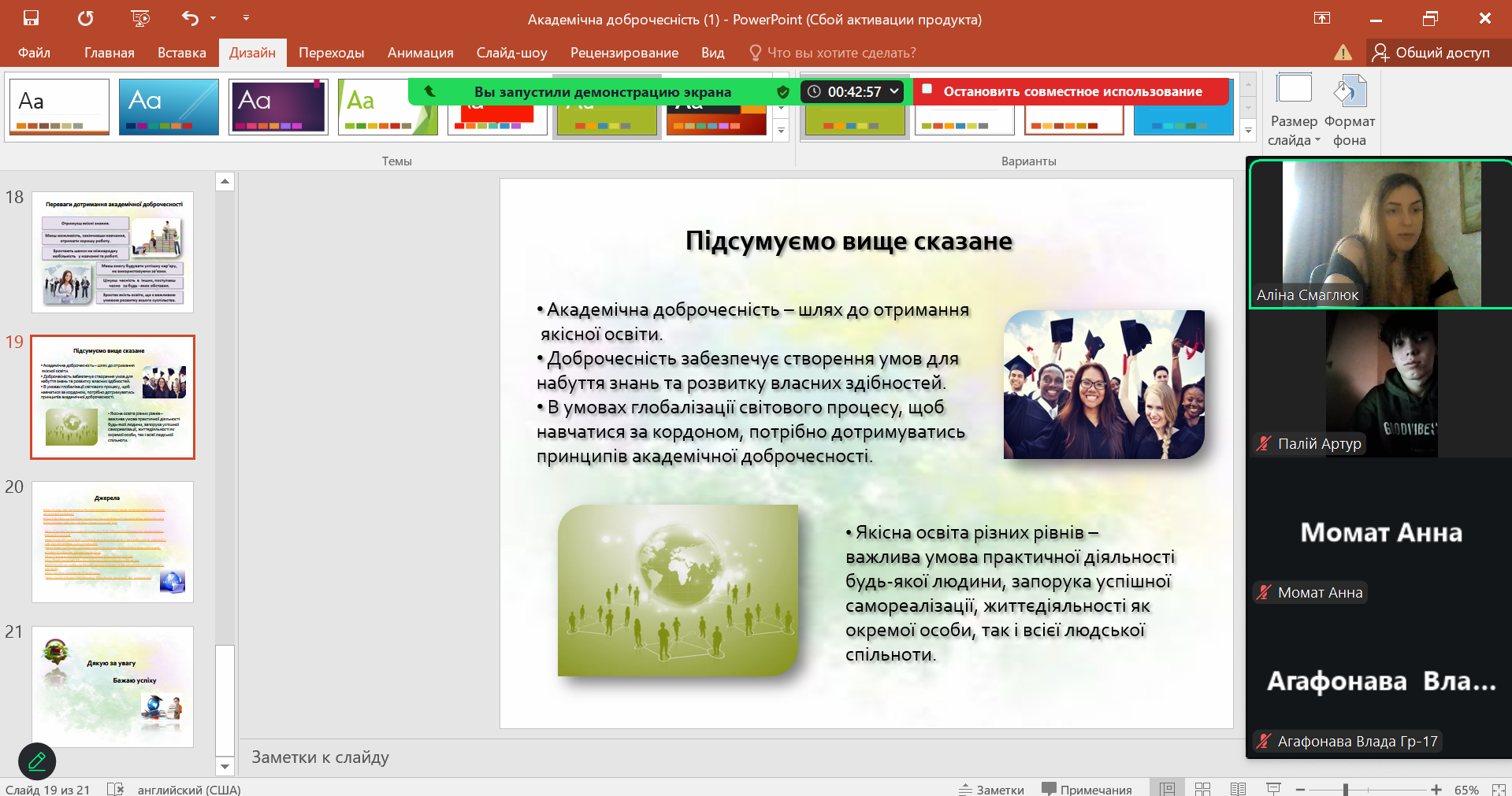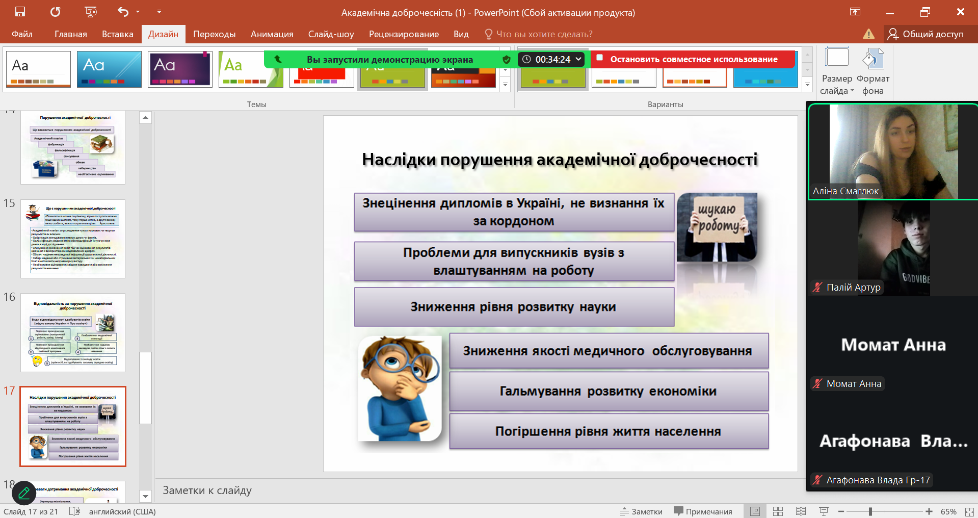 Під час кураторської години здобувачі освіти мали змогу поглибити вже наявні знання про принципи академічної доброчесності, актуалізувати розуміння важливості чесності в освітньому процесі та ще раз звернути увагу на правила, яких необхідно дотримуватися під час навчання. Також було обговорено ключові цінності доброчесності та їх роль у формуванні відповідального студентського середовища.