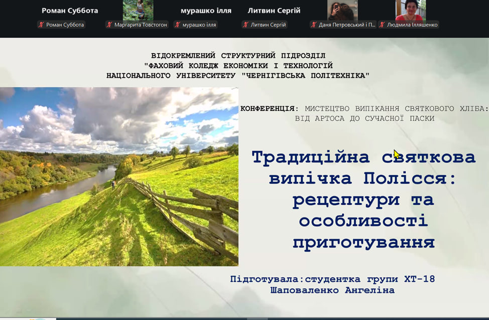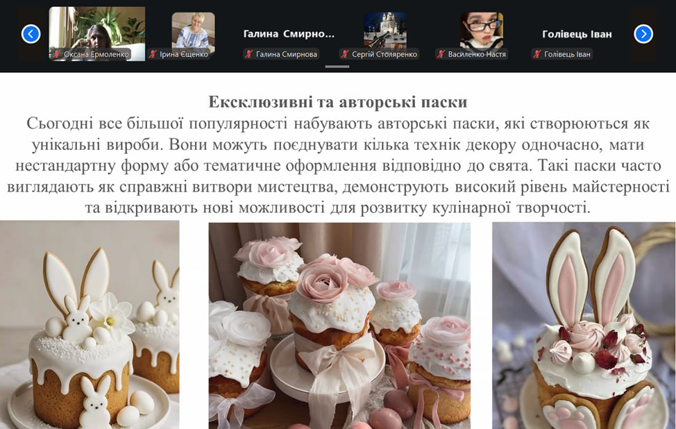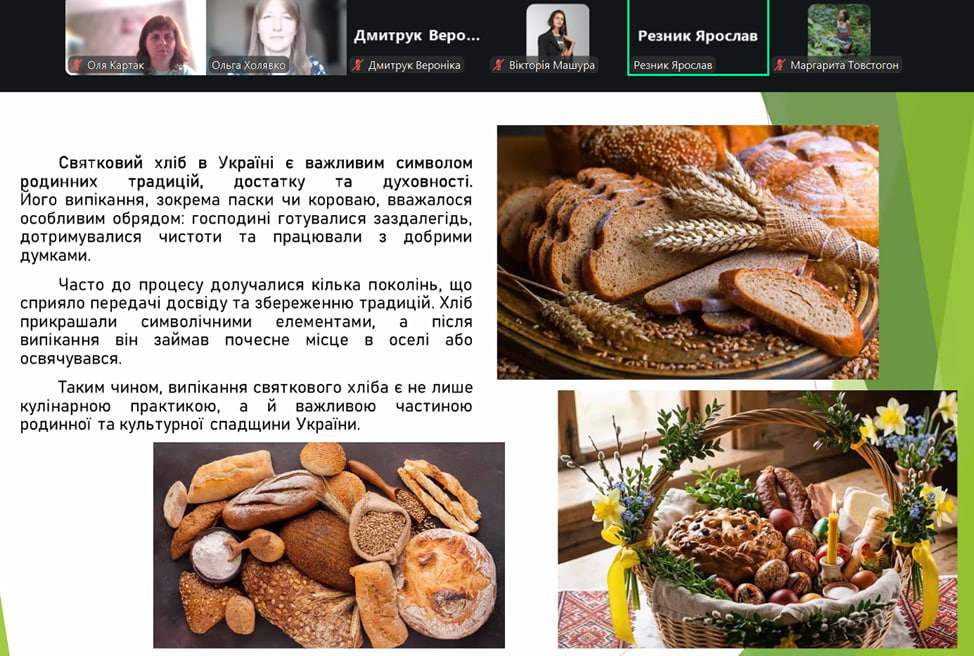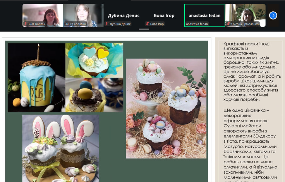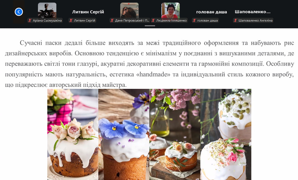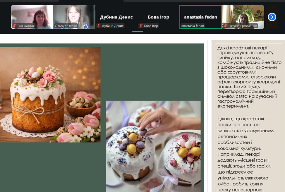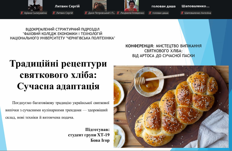 У ході конференції здобувачі освіти представили доповіді та презентації, у яких висвітлили технологічні особливості випікання святкового хліба, дослідили еволюцію традицій – від стародавнього артоса до сучасної паски, а також продемонстрували сучасні підходи до оформлення виробів.