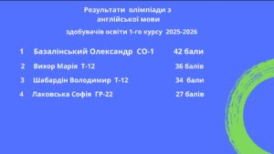 25 лютого 2026 року циклова комісія гуманітарних дисциплін ,незважаючи на надскладні умови організації у вигляді відсутності світла та інтернету, провела олімпіаду з англійської мови для здобувачів 1 та 2 курсів.Учасники продемонстрували високий рівень володіння мовою, зокрема з говріння, аудіювання та читання. Дякуємо нашим здобувачам за їх наполегливість у навчанні та вмотивованість отримувати максимум знань! Найкращими серед першого та другого курсів виявились Базалінський Олександр СО 1 викладач Майя Люлька та Корнач Антон ФБ12 викладач Лариса Кудряшова Щиро вітаємо і пишаємось вами!!