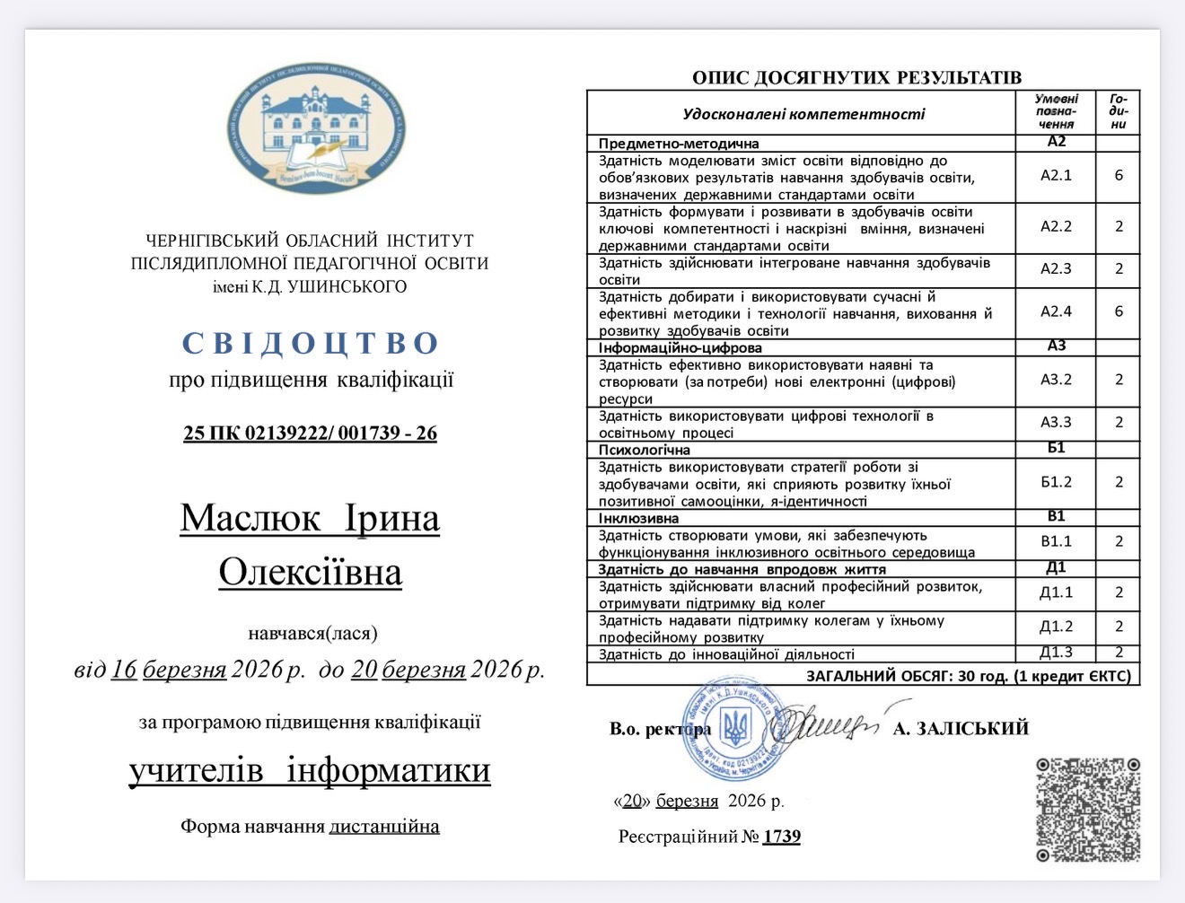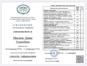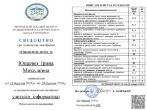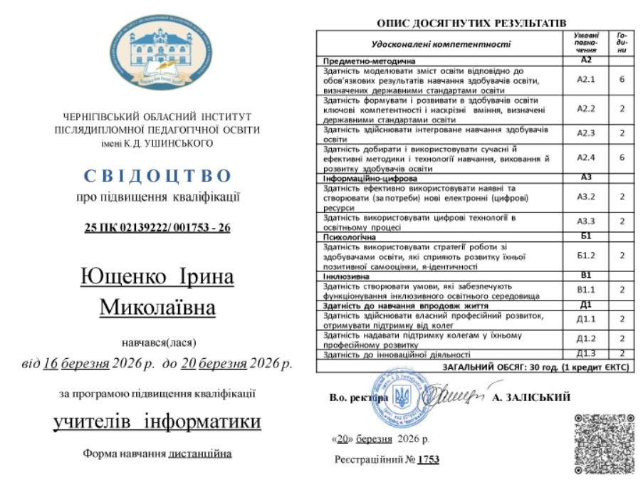 З 16 березня 2026 року по 20 березня 2026 року на базі Чернігівського обласного інституту післядипломної педагогічної освіти імені К.Д. Ушинського відбулося дистанційне навчання педагогічних працівників за програмою підвищення кваліфікації учителів інформатики.