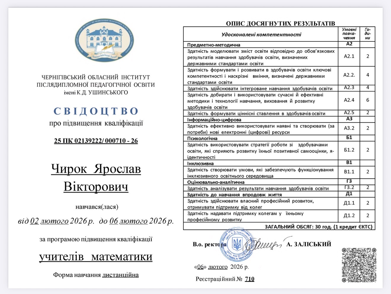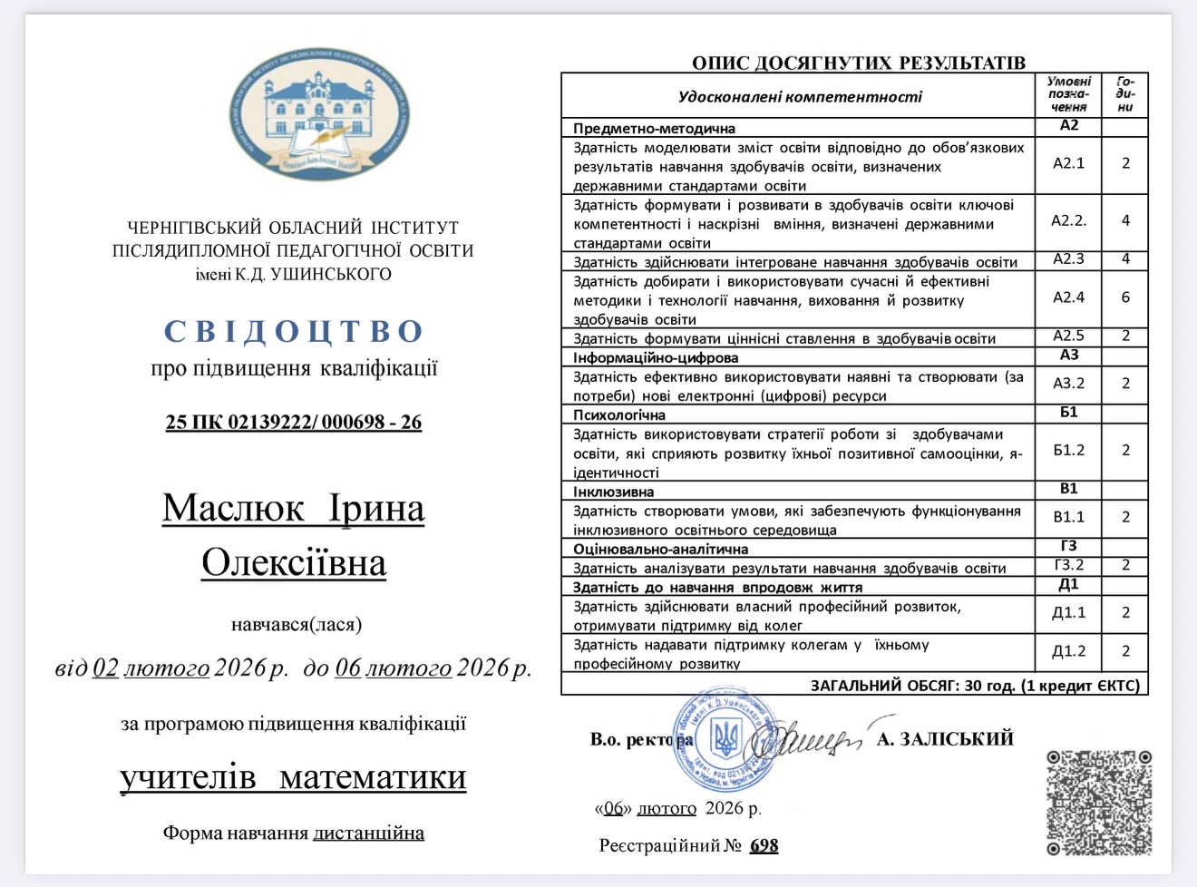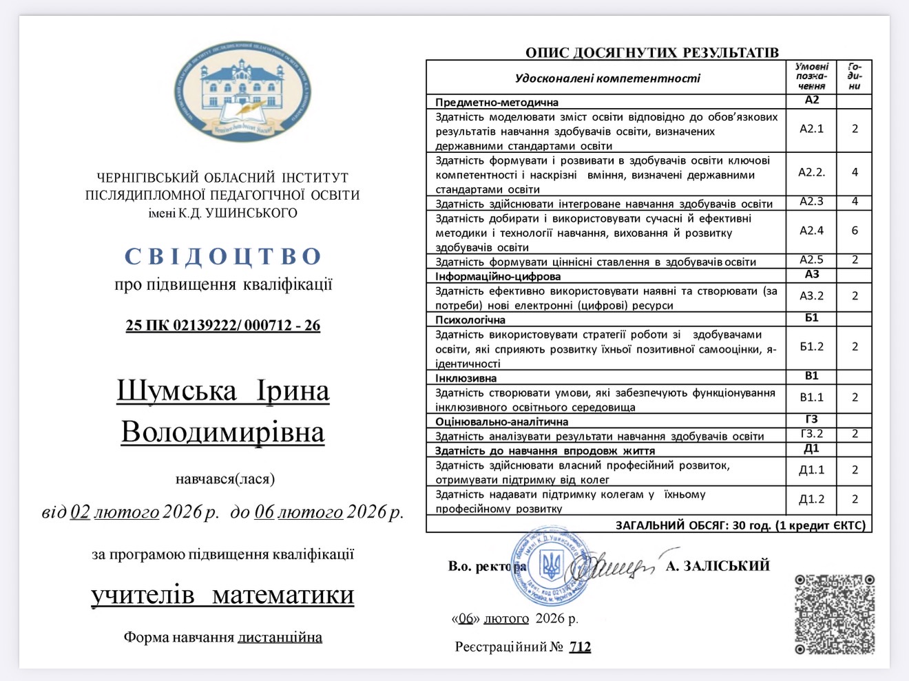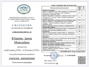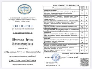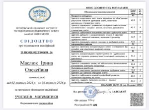 З 02 лютого 2026 року по 06 лютого 2026 рокуна базі Чернігівського обласного інституту післядипломної педагогічної освіти ім. Ушинськоговідбулося онлайн-навчання педагогічних працівників за програмою підвищення кваліфікації учителів математики. Підвищення кваліфікації проходили Ющенко І.М. Шумська І.В., к.е.н. Маслюк І.О, Чирок Я.В.