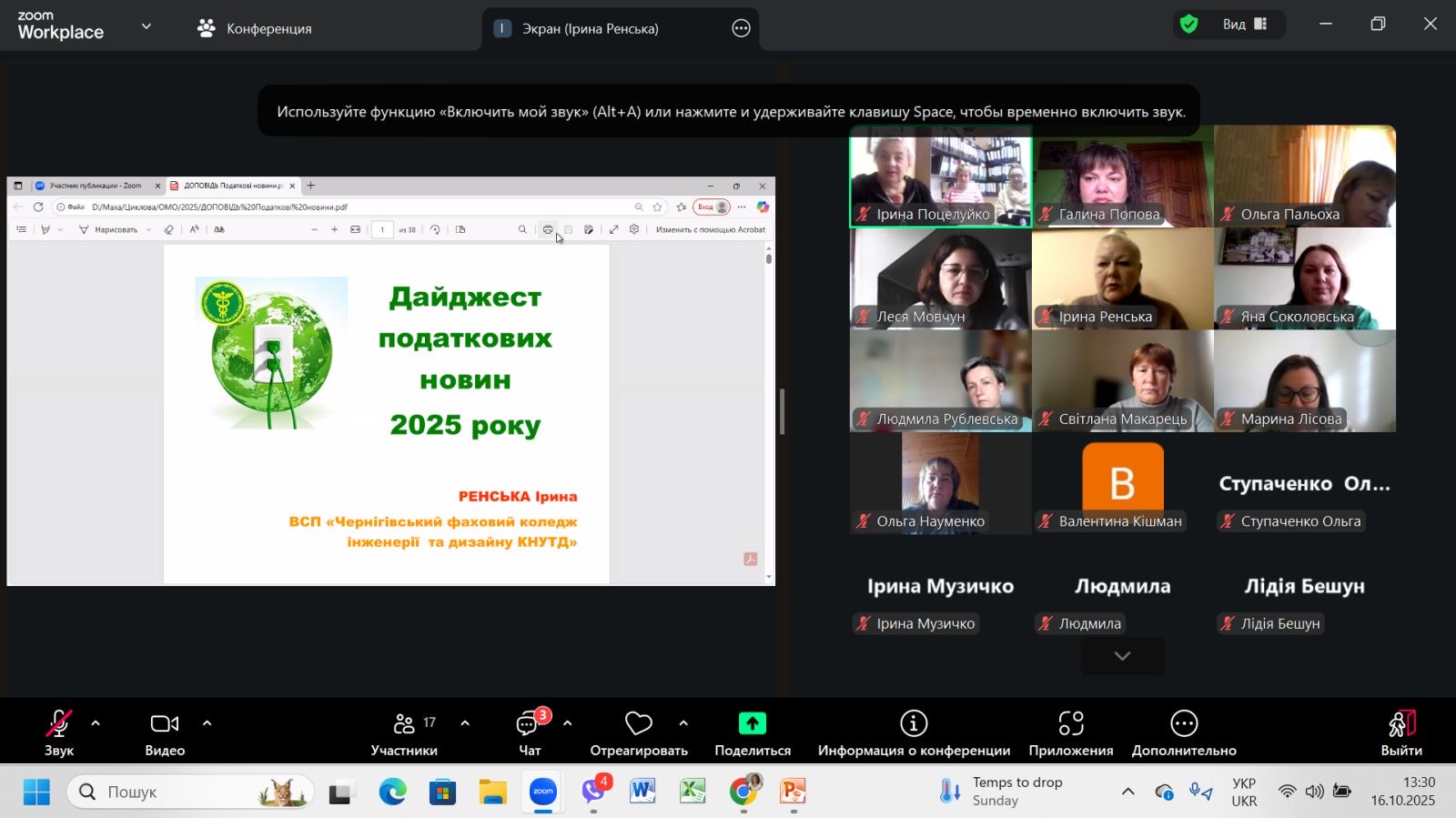 • Підведення підсумків роботи ОМО за 2024-2025 н.р. – Ірина ПОЦЕЛУЙКО – голова обласного методичного об’єднання викладачів обліково – економічних дисциплін закладів фахової передвищої освіти Чернігівської області.