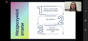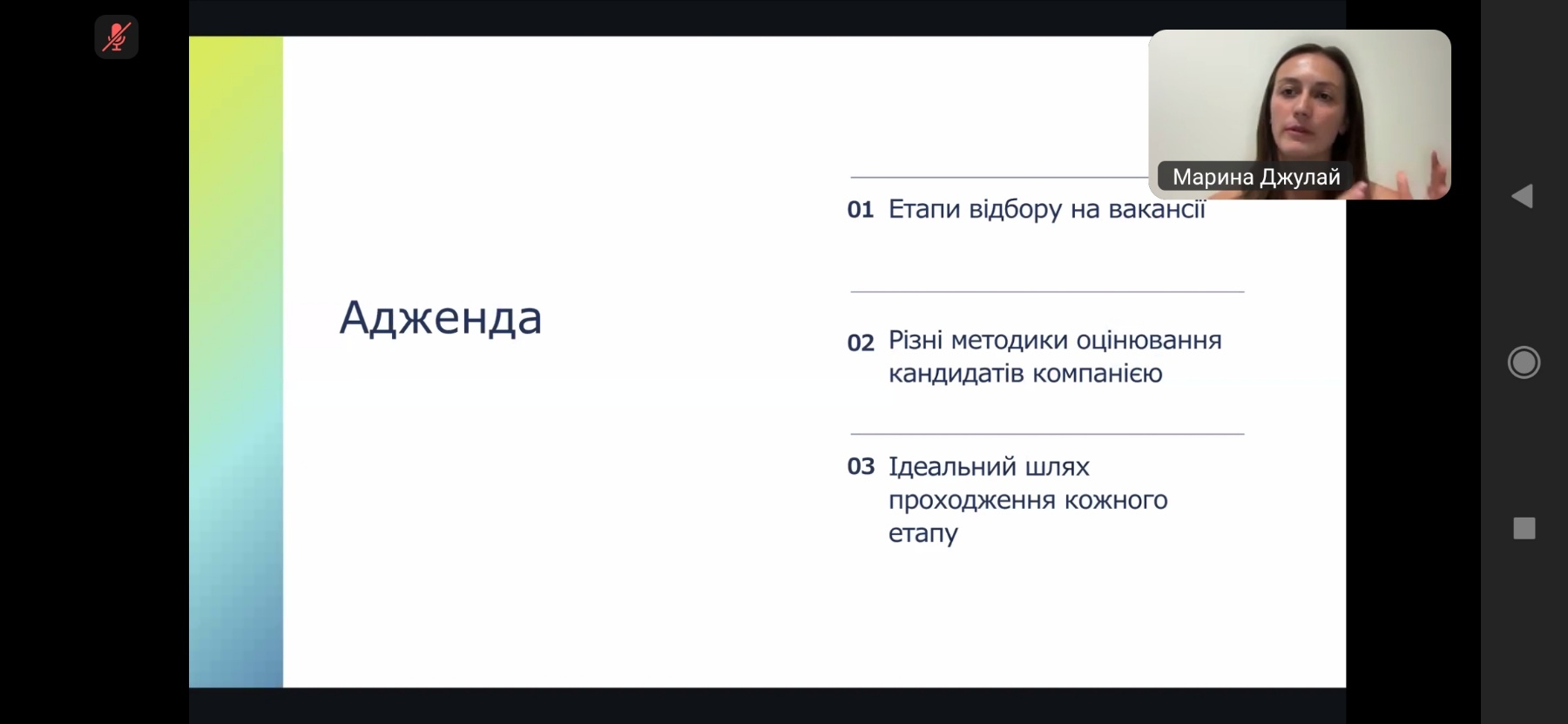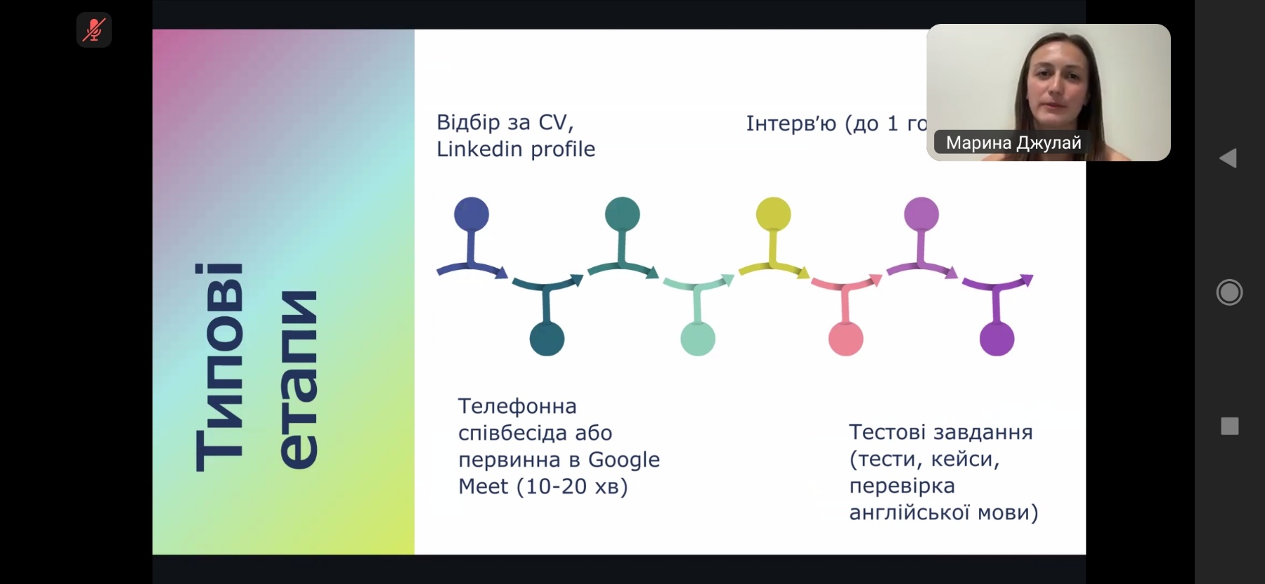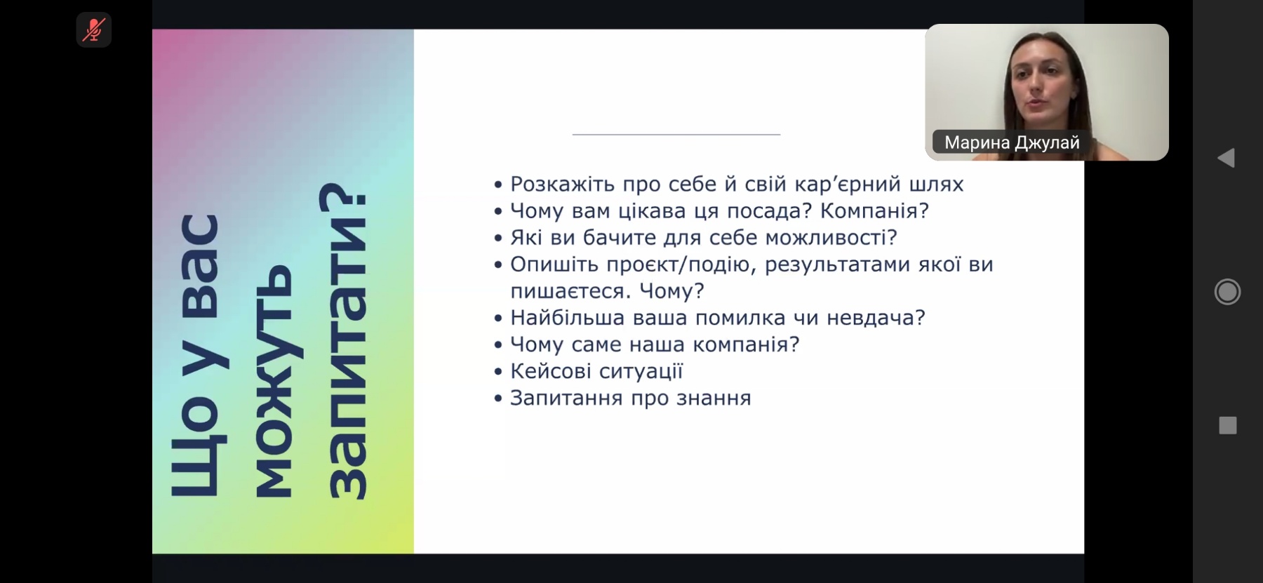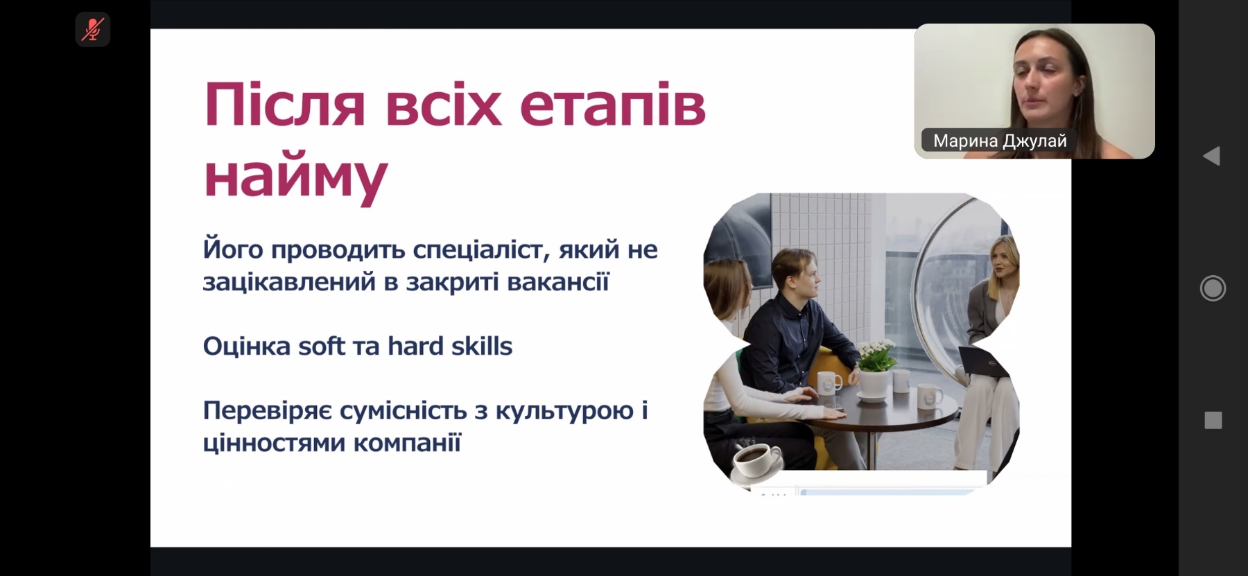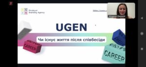 Марина ДЖУЛАЙ, СЕО UGEN Ukraine, розповіла про етапи відбору на вакансії, методики оцінювання кандидатів компаніями, типові помилки при складанні резюме та заповненні профілю LinkedIn, дала поради щодо проходження кожного етапу відбору. Учасники дізнались, що відбувається після проходження співбесіди, що таке бар рейзинг та скільки часу очікувати відповіді роботодавця. Наприкінці вебінару відбулась сесія запитань та відповідей.