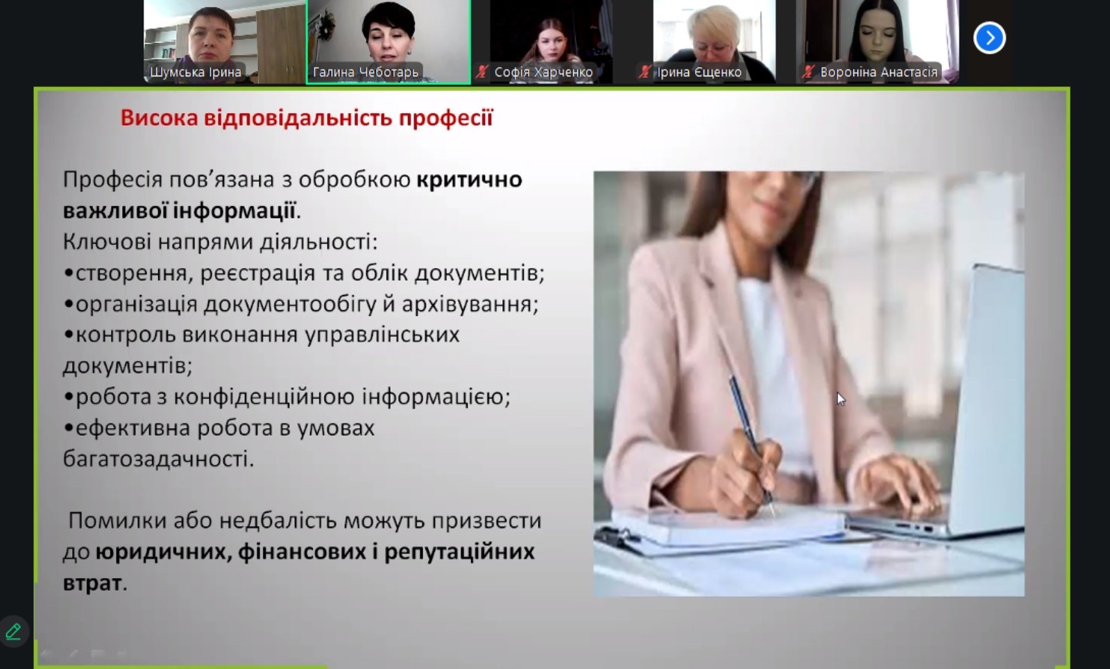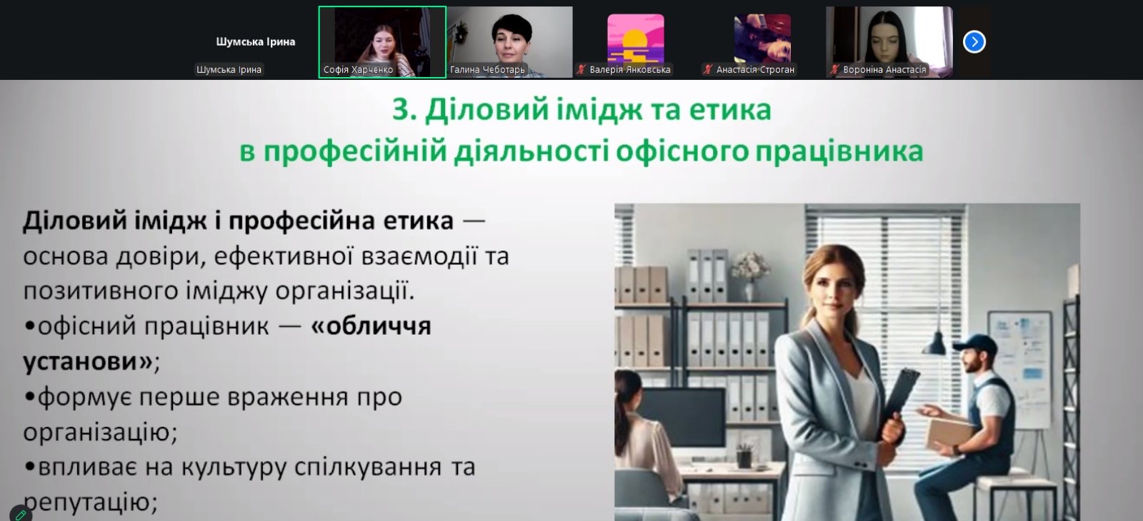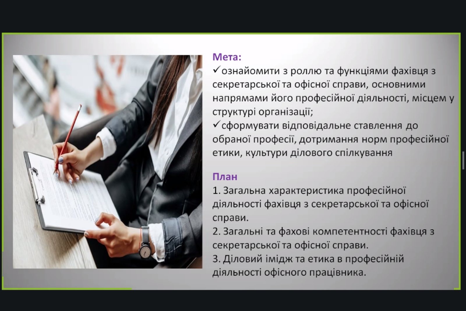Тема заняття є актуальною, оскільки сприяє формуванню у здобувачів освіти цілісного уявлення про майбутню професійну діяльність, вимоги сучасного ринку праці, професійні компетентності та етичні норми роботи офісного працівника.