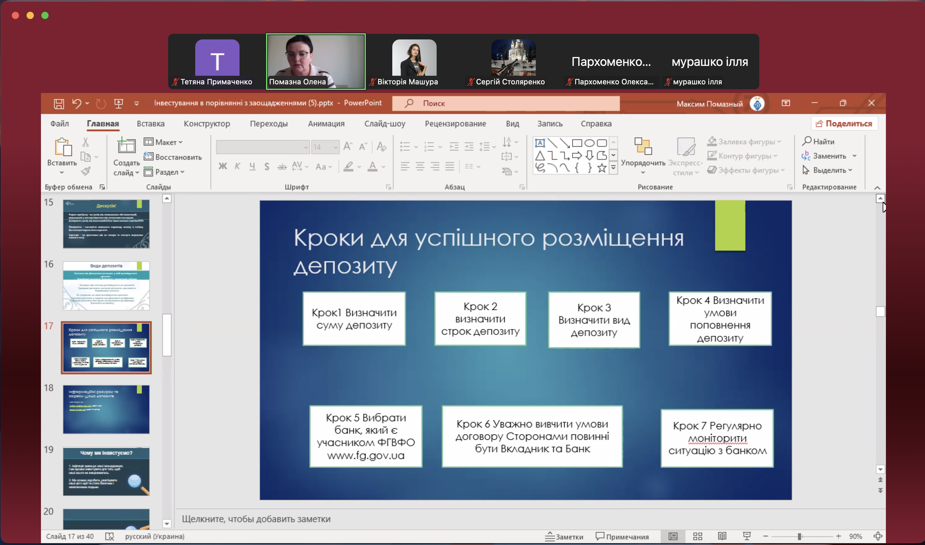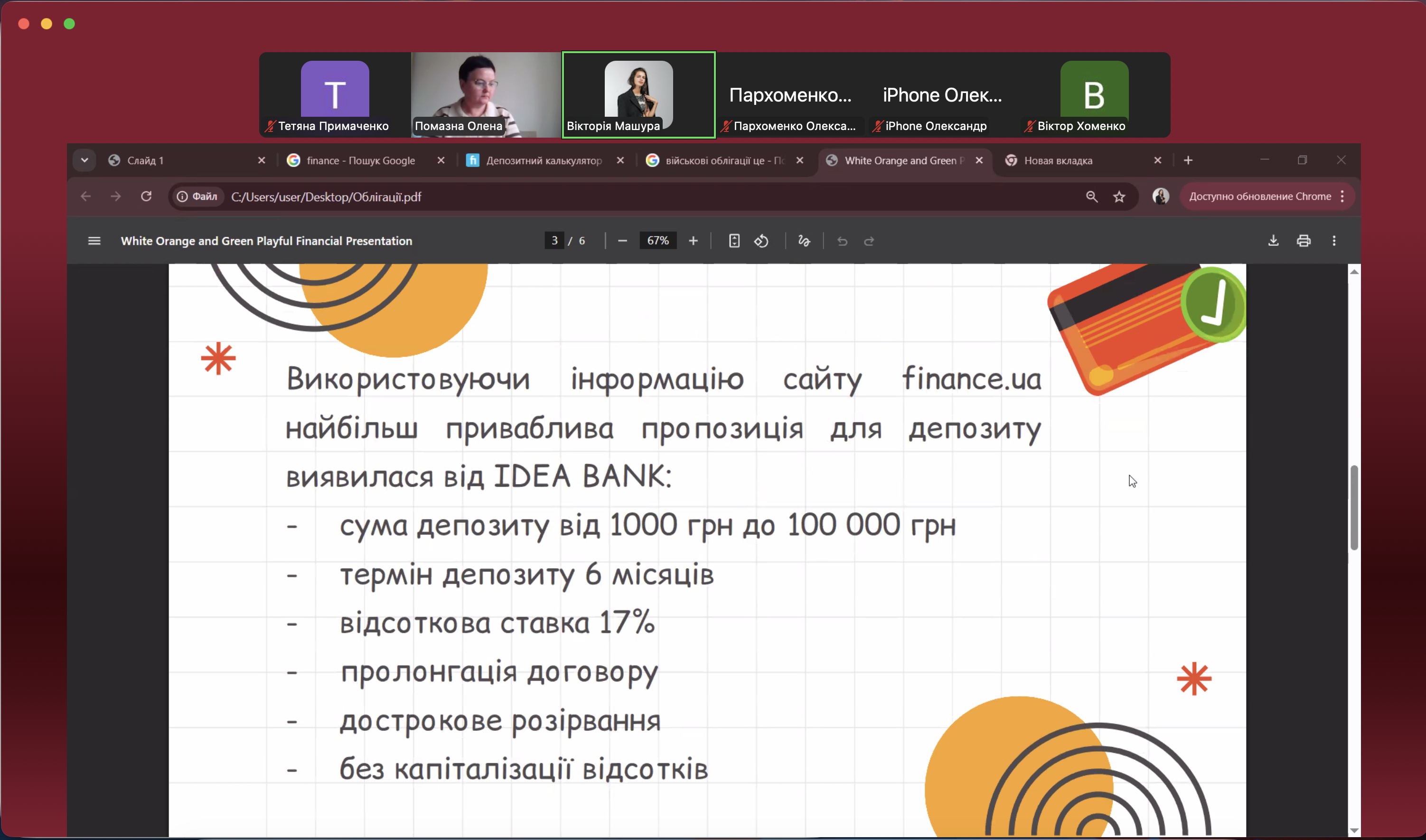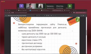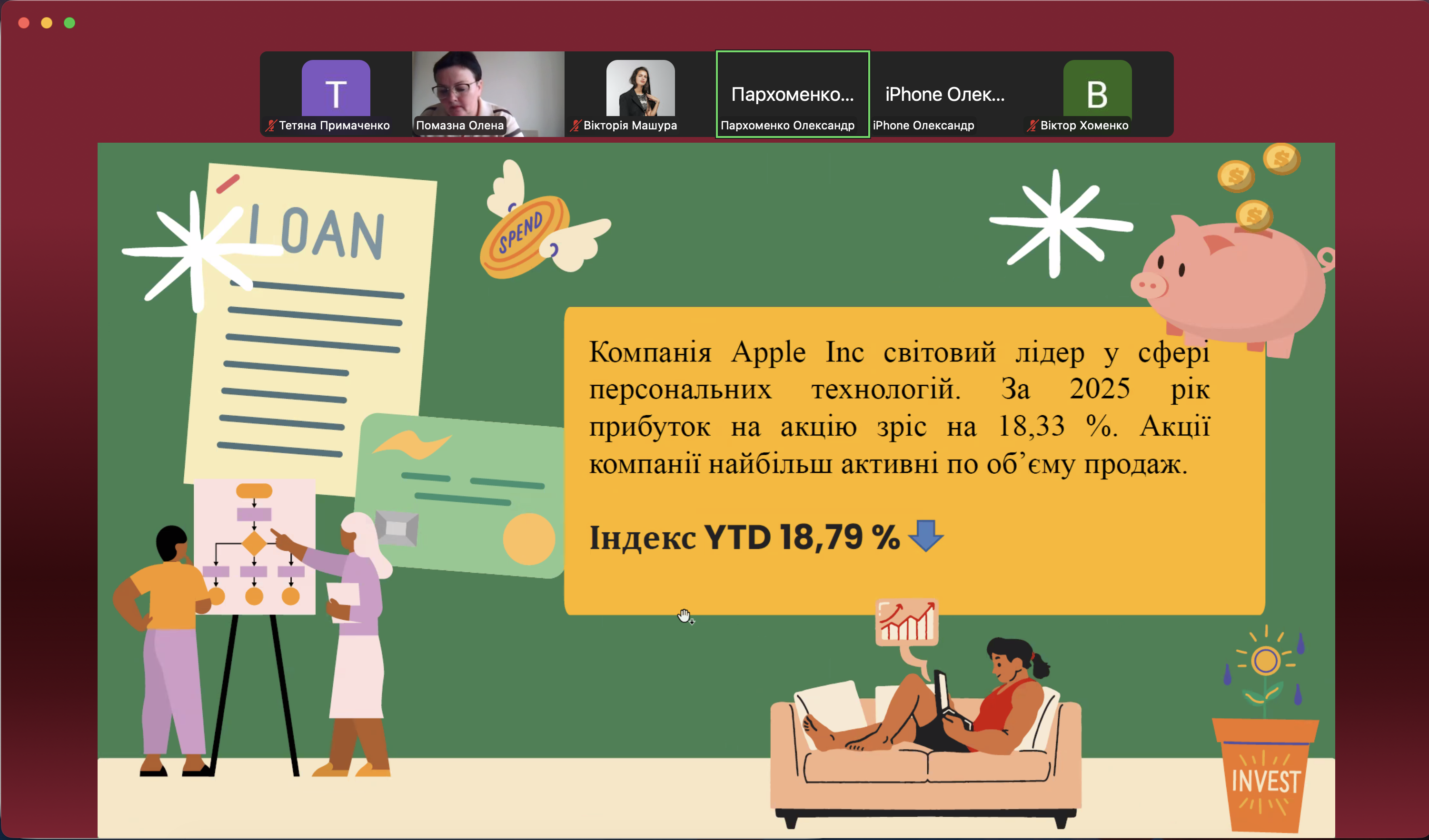 Здобувачі освіти Олександр Пархоменко, Ігор Бова, Олександр Казнадій та Вікторія Машура продемонстрували результати власних досліджень щодо формування інвестиційного портфелю та прибутковості розміщення заощаджень в акціях різних компаній, порівняли дохідність від депозитів в банківських установах та облігаціях.