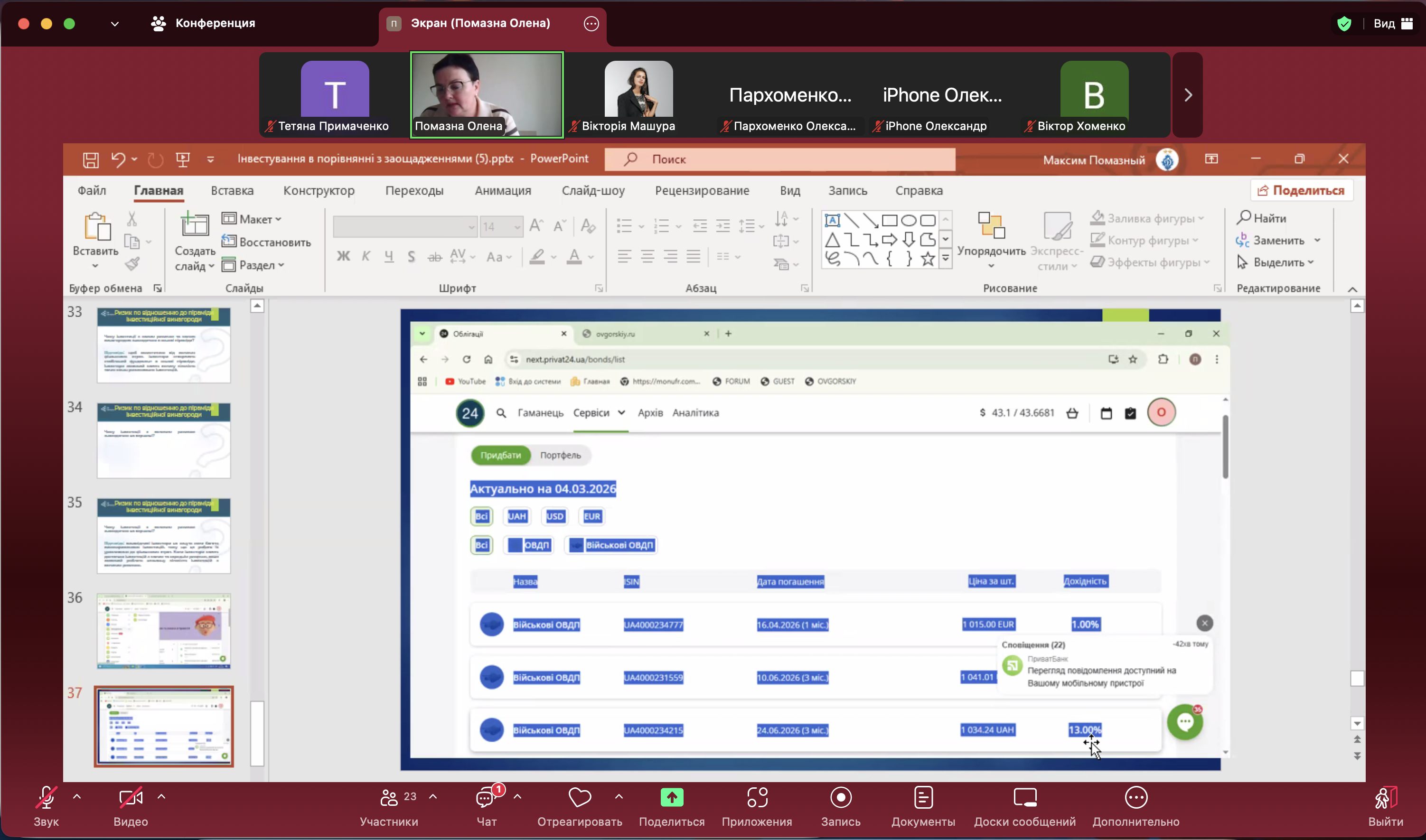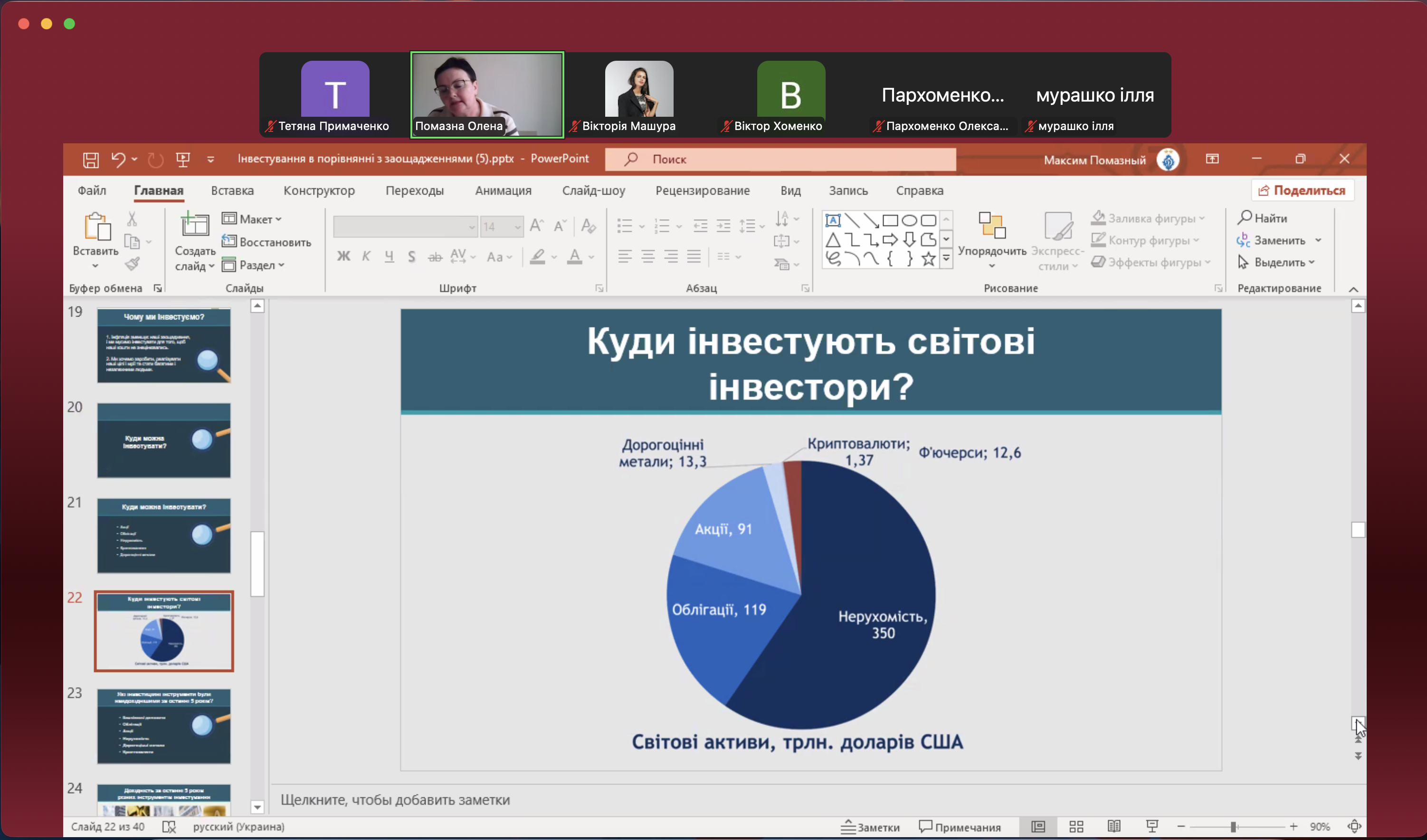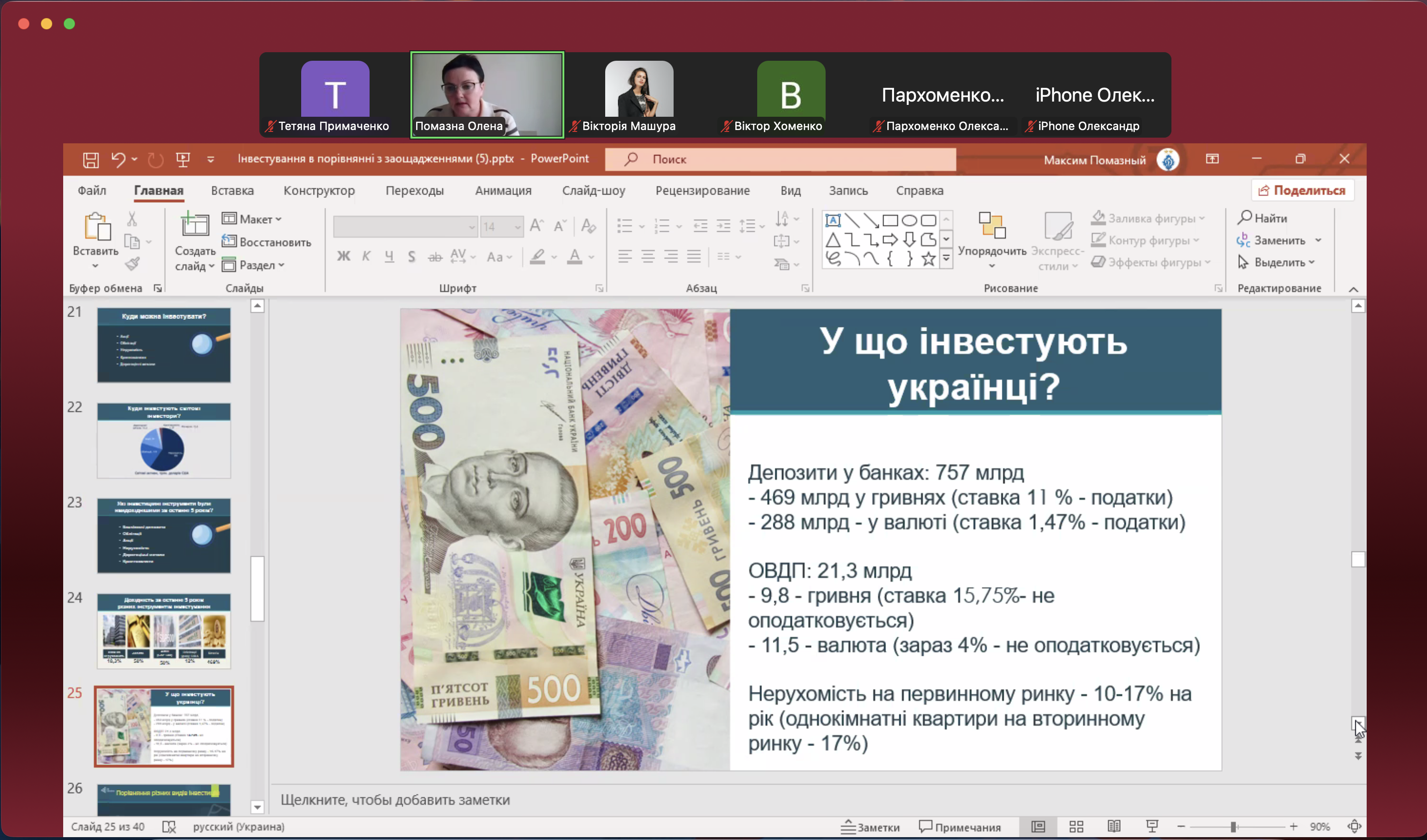 Здобувачі освіти Олександр Пархоменко, Ігор Бова, Олександр Казнадій та Вікторія Машура продемонстрували результати власних досліджень щодо формування інвестиційного портфелю та прибутковості розміщення заощаджень в акціях різних компаній, порівняли дохідність від депозитів в банківських установах та облігаціях.