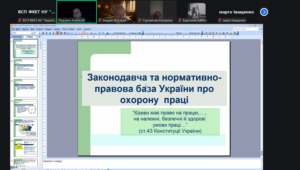 Акцент викладачем було зроблено на основні законодавчі акти про охорону праці: Конституцію України, закон України “Про охорону праці”, Кодекс цивільного захисту України, Кодекс законів про працю України. Державні міжгалузеві та галузеві нормативно-правові акти про охорону праці (НПАОП).