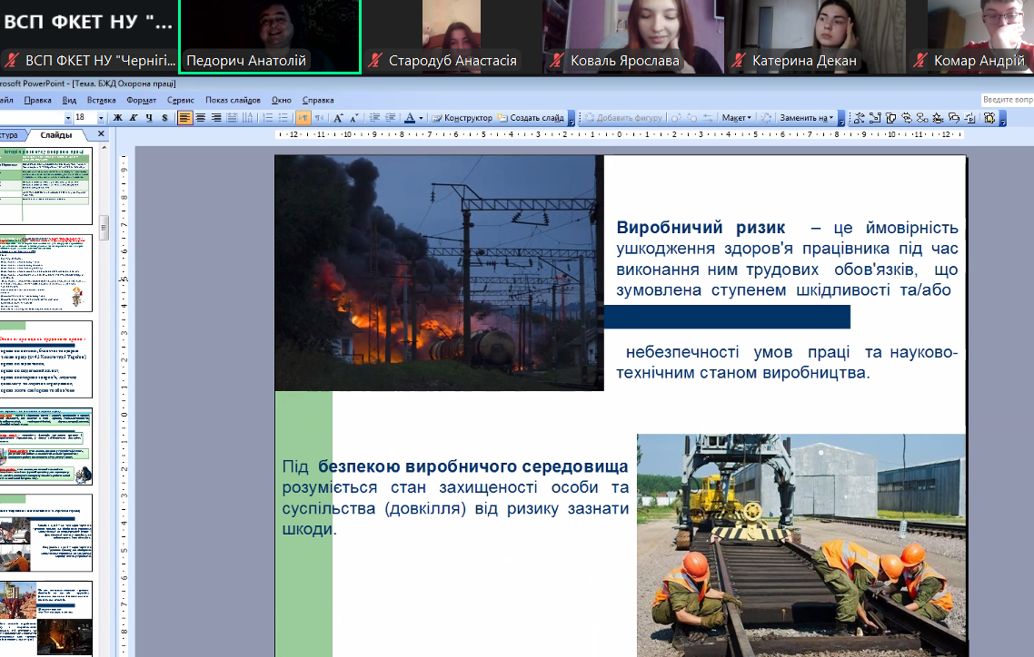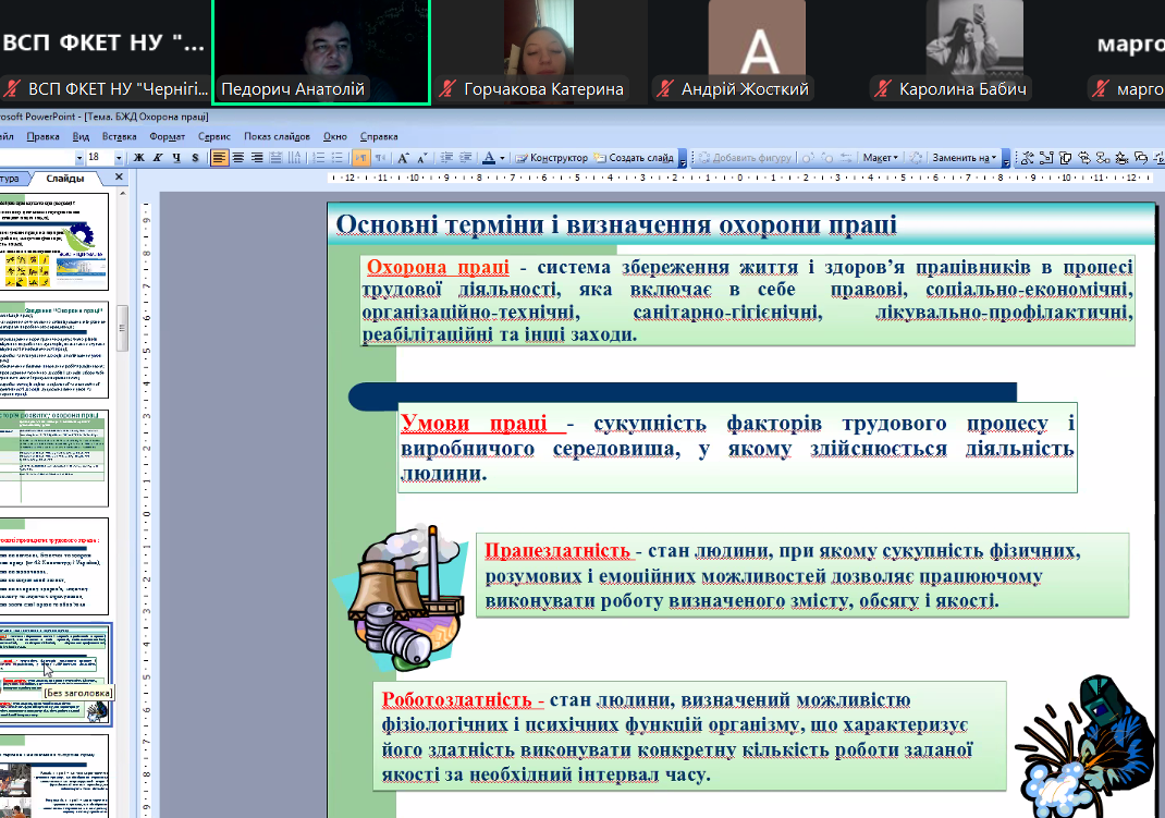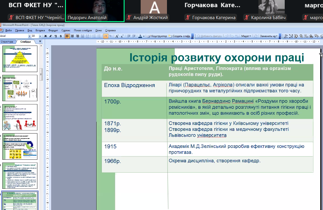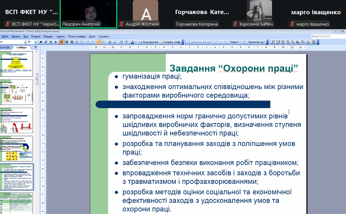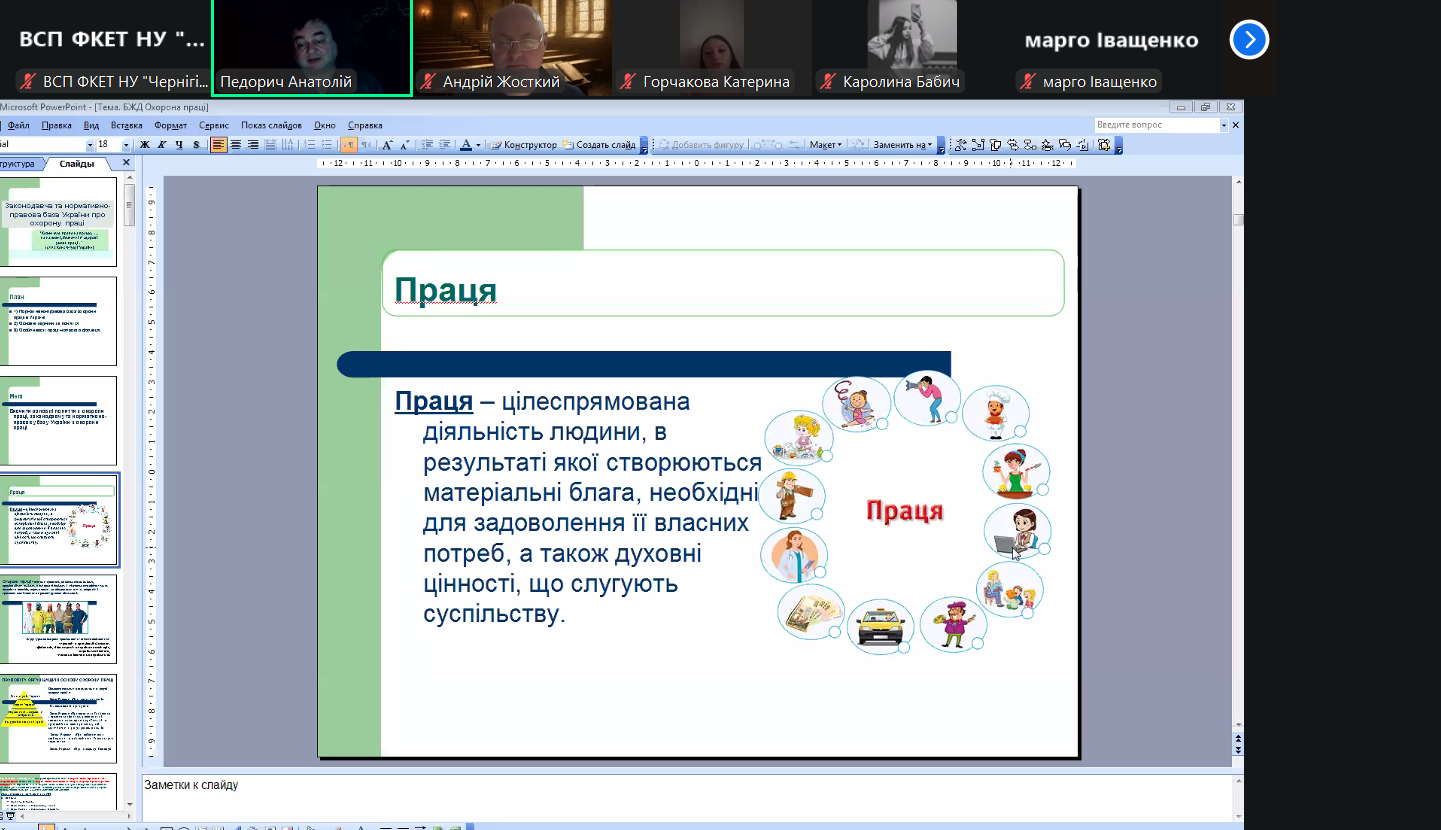 На занятті під керівництвом лектора розглянули соціально-економічне значення охорони праці, познайомилися з основними поняттями у галузі охорони праці, проаналізували сучасний стан охорони праці, виробничого травматизму та професійної захворюваності в Україні.