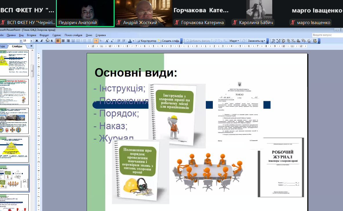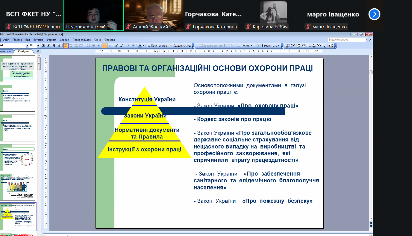 Акцент викладачем було зроблено на основні законодавчі акти про охорону праці: Конституцію України, закон України “Про охорону праці”, Кодекс цивільного захисту України, Кодекс законів про працю України. Державні міжгалузеві та галузеві нормативно-правові акти про охорону праці (НПАОП).