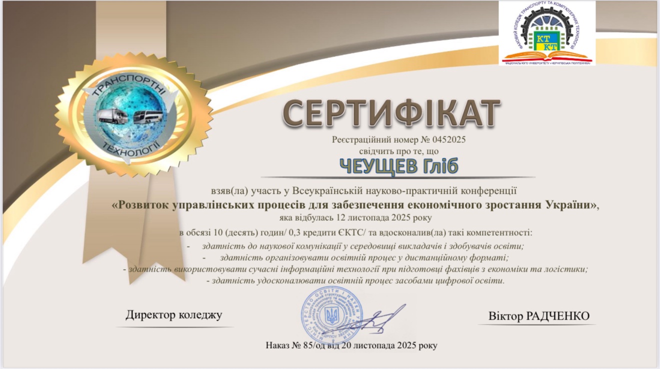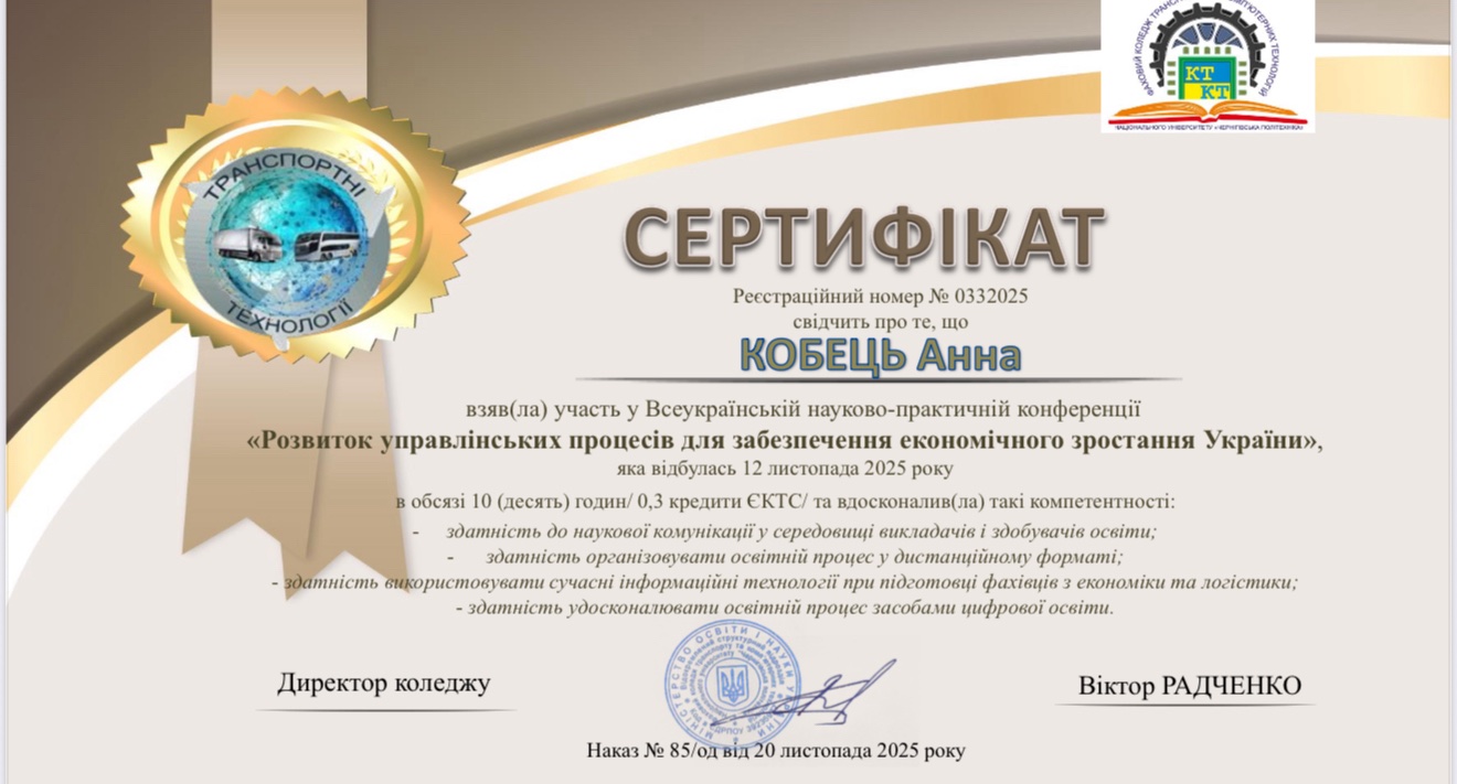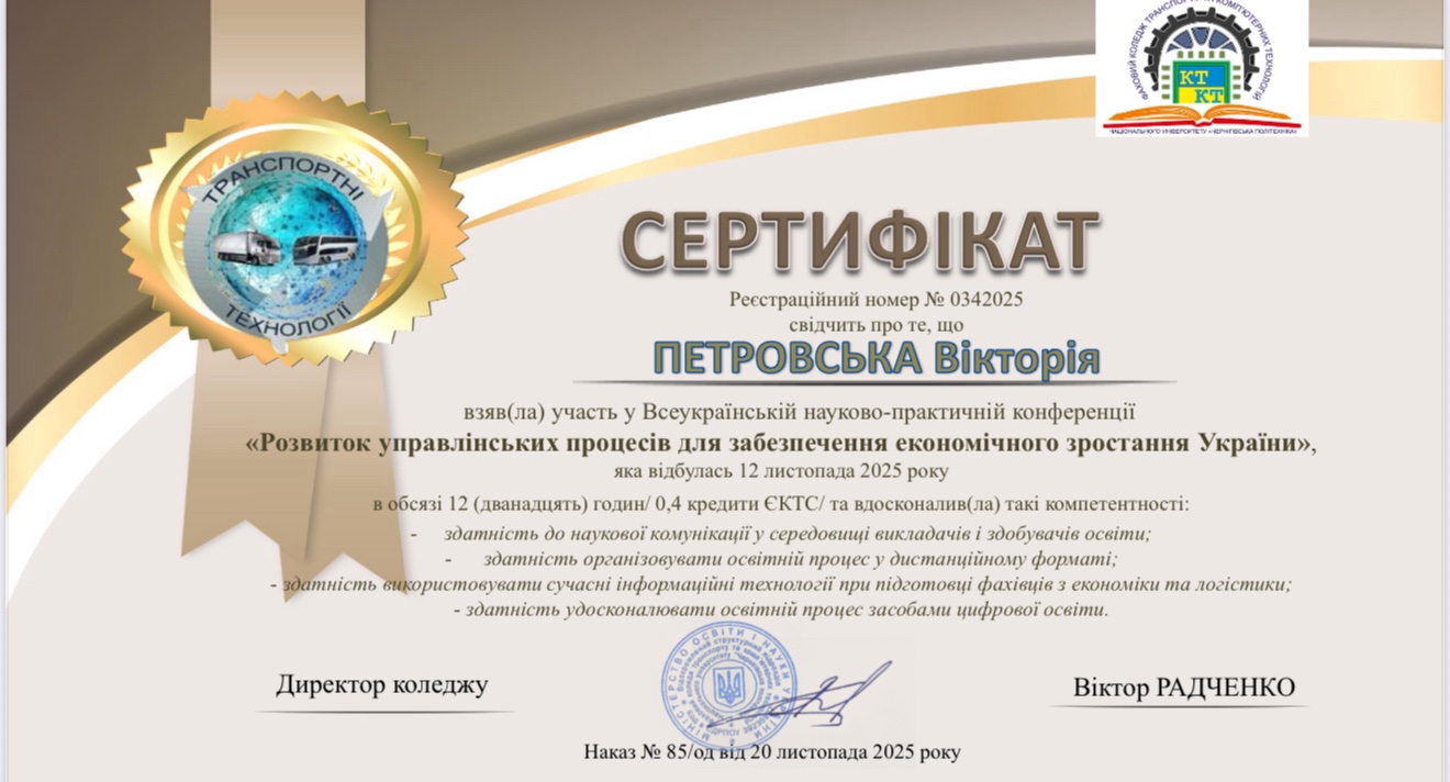 Викладачі коледжу Вікторія ПЕТРОВСЬКА, Галина ПОПОВА та здобувач освіти Гліб ЧЕУШЕВ прийняли участь та Кобець Анна у ВСЕУКРАЇНСЬКІЙ НАУКОВО – ПРАКТИЧНІЙ КОНФЕРЕНЦІЇ «Розвиток управлінських процесів для забезпечення економічного зростання України».
