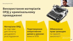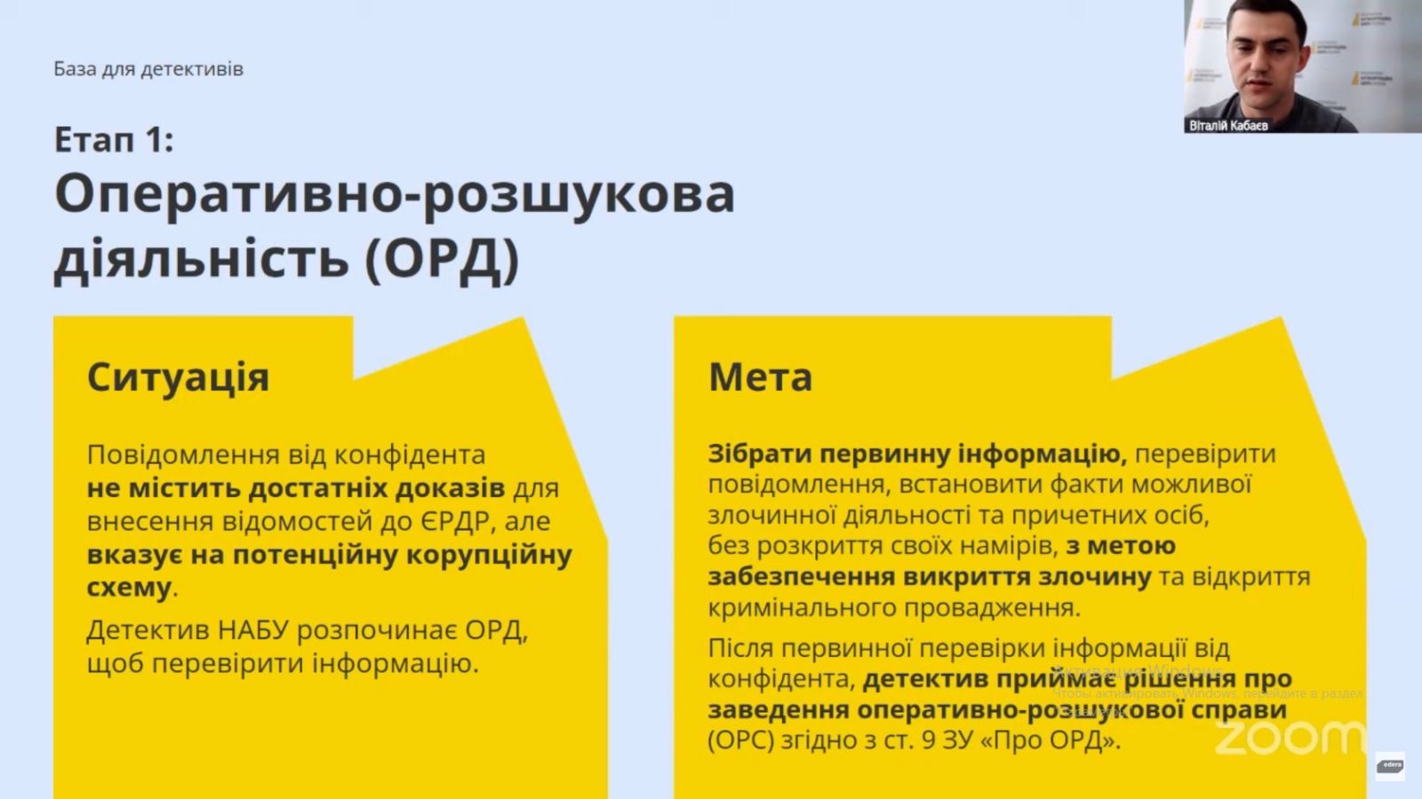 Вебінар провів старший детектив НАБУ Віталій Кабаєв, який поділився практичним досвідом та знаннями. Він розповів про основні завдання оперативно-розшукової діяльності, підстави для проведення розшуку та умови для початку розслідування. Особливу увагу було приділено питанню, як проводити розслідування ефективно, щоб викрити винних у корупційних злочинах.