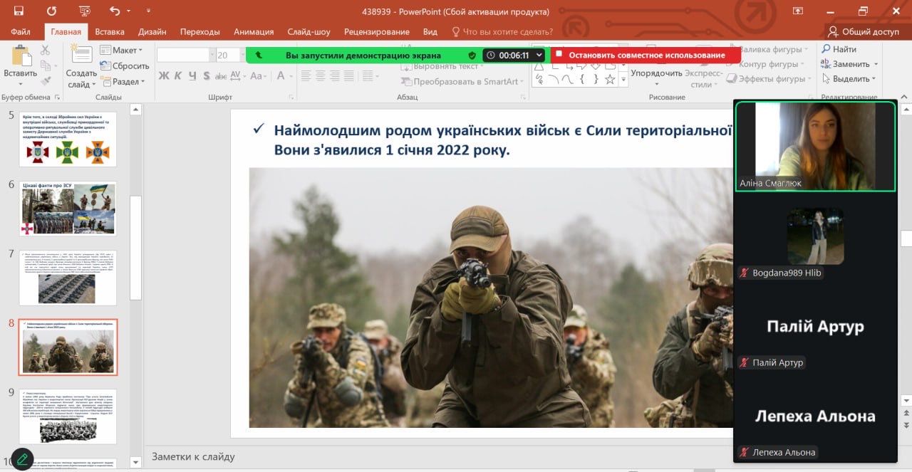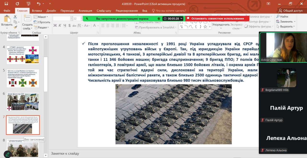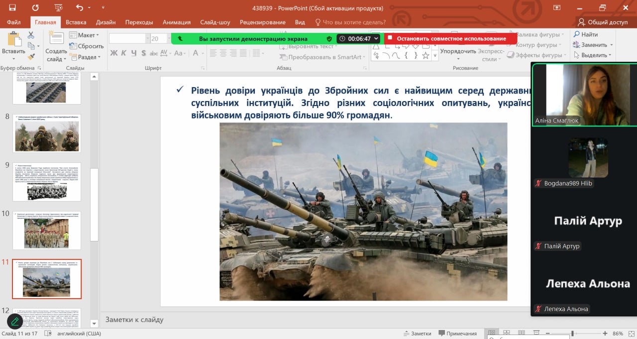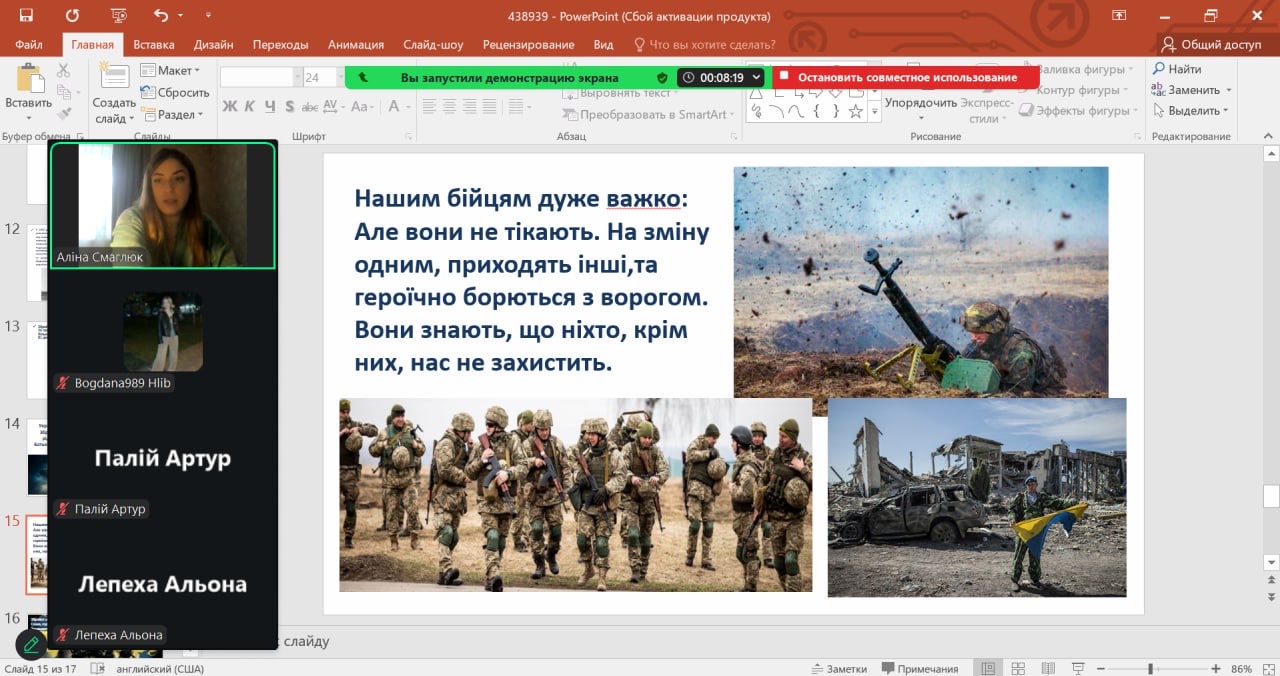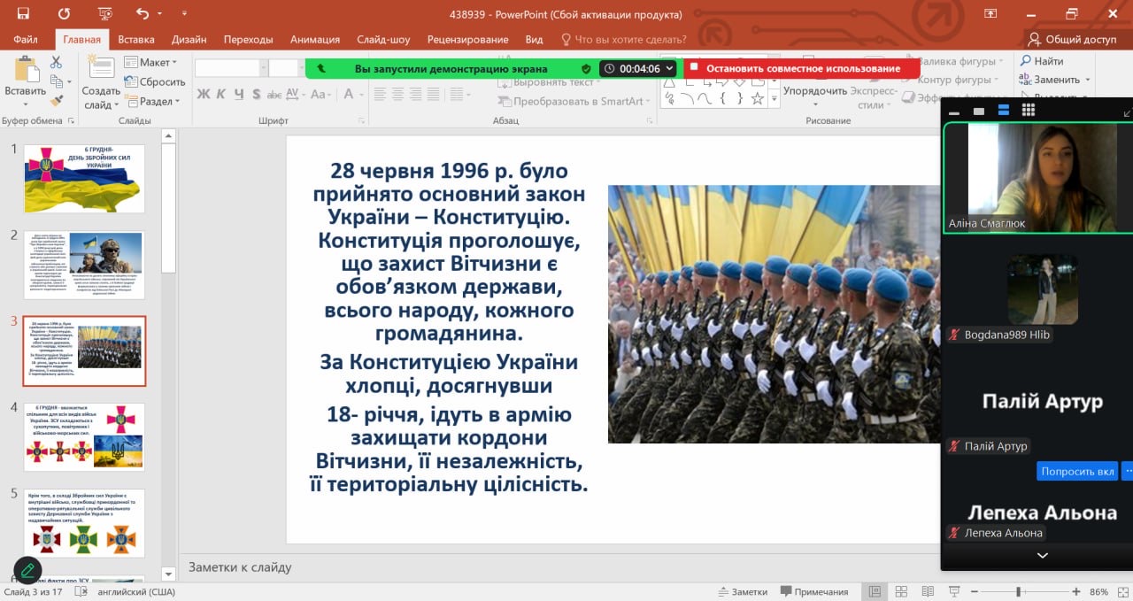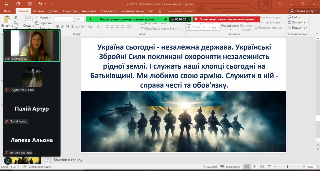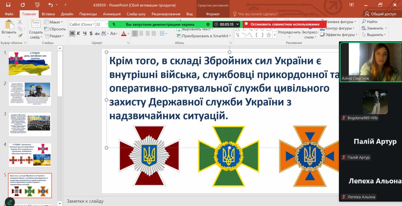 Виховну годину провела куратор А. О. Смаглюк, яка наголосила на важливості поваги до військовослужбовців, патріотичного виховання молоді та розуміння значення служби в ЗСУ для майбутнього України.