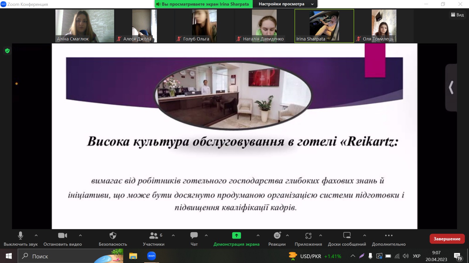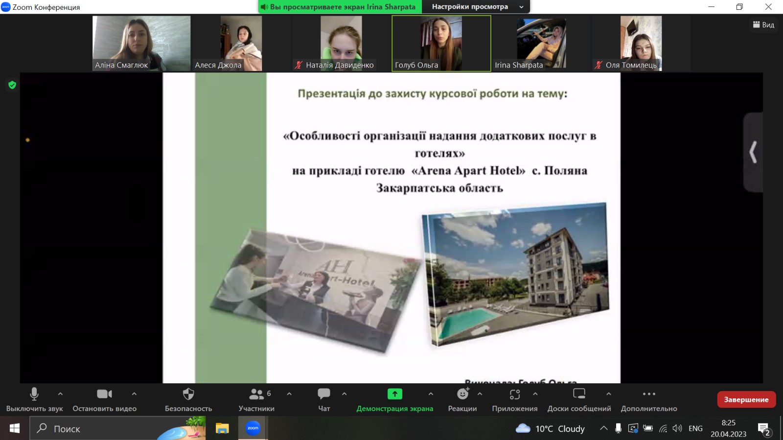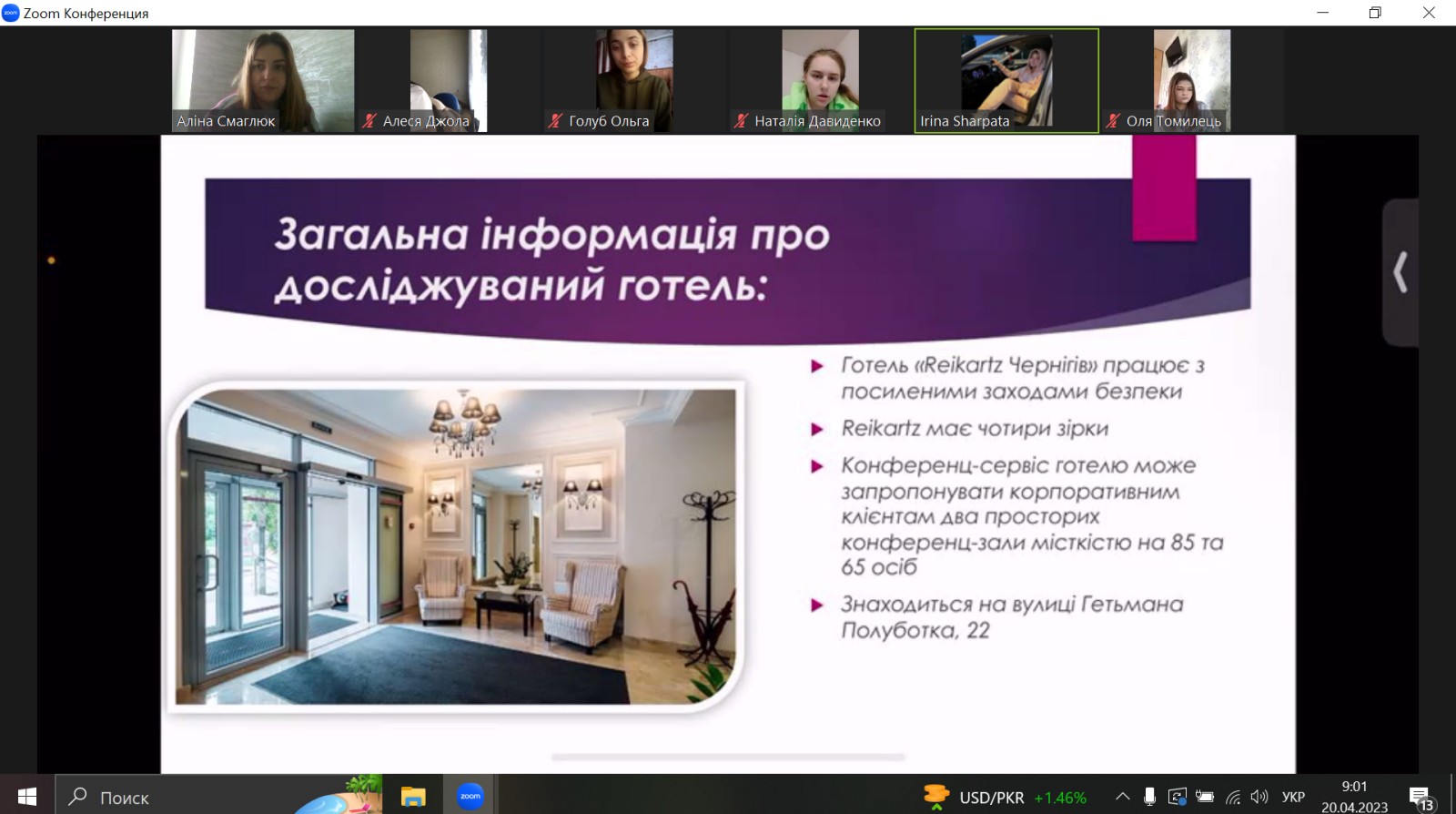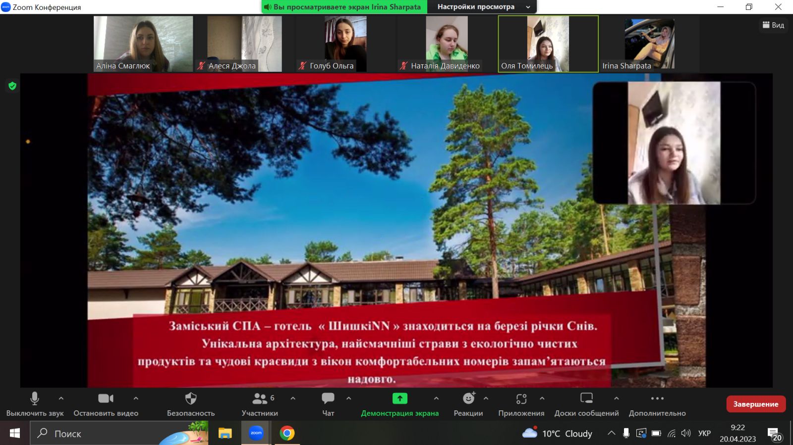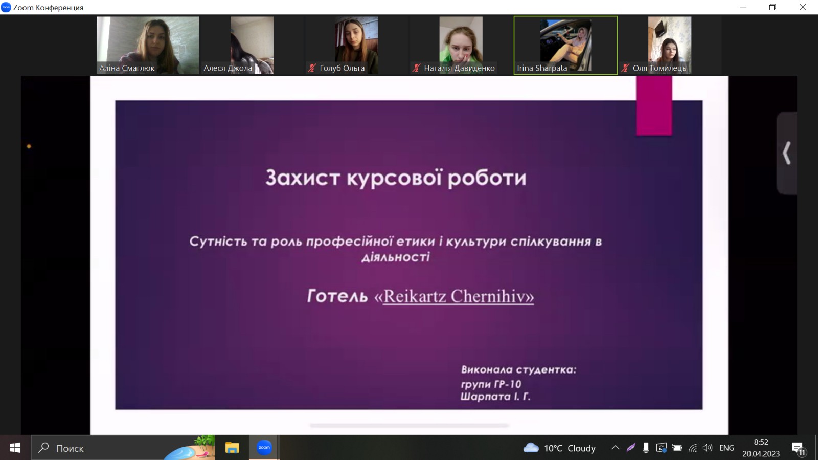 20 квітня 2023 року відбувся публічний захист курсових робіт здобувачів фахової передвищої освіти групи ГР-10 ОПП 241 Готельно-ресторанна справа під керівництвом викладача А. О. Смаглюк. Захід відбувся в онлайн форматі за допомогою комунікаційної платформи Zoom.