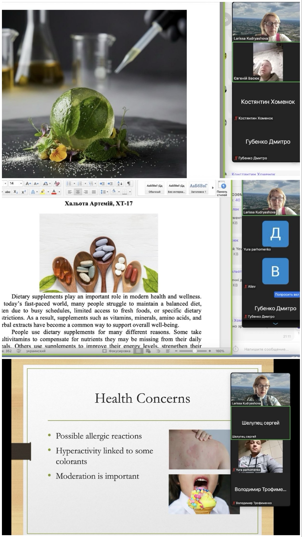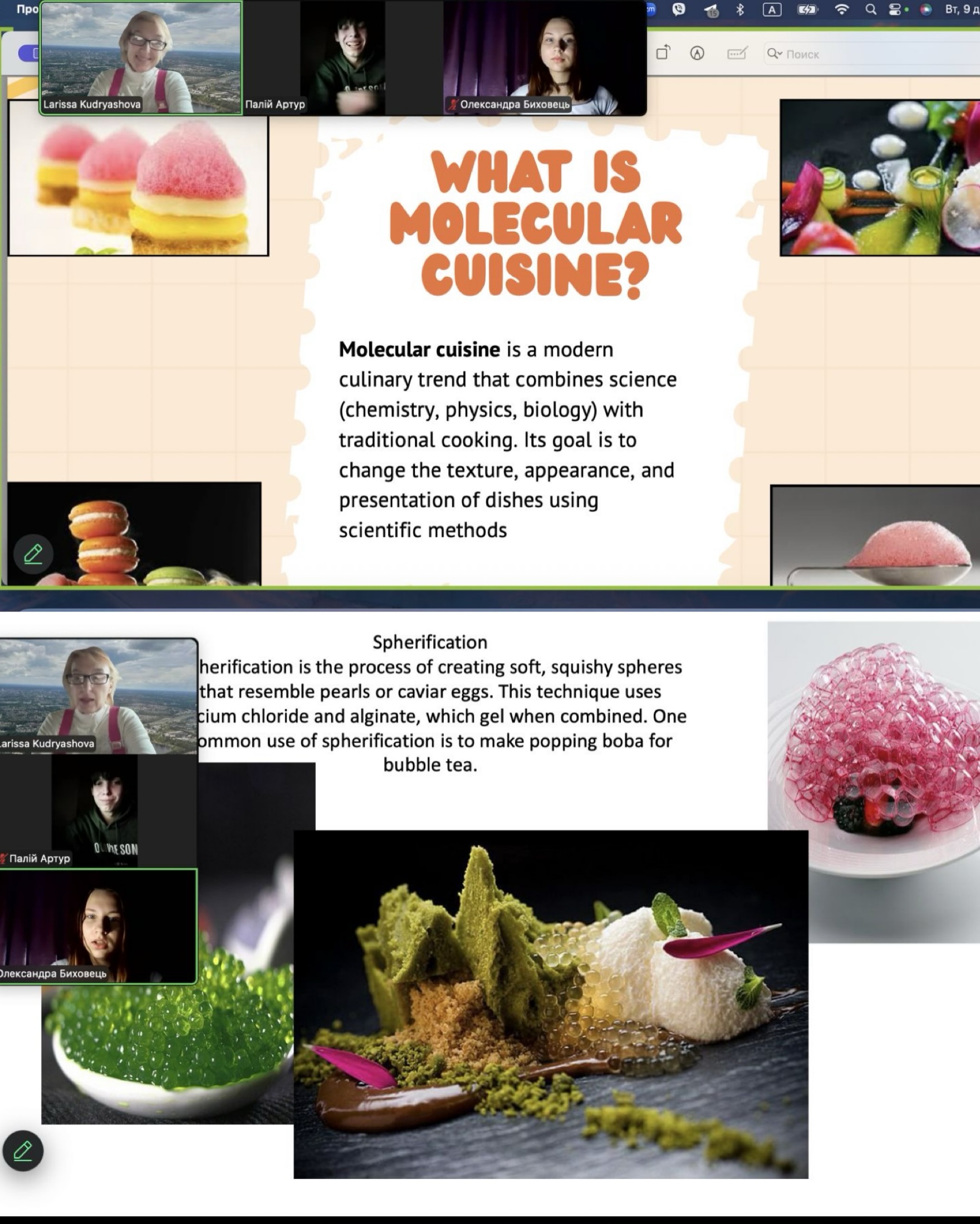 09.12.2025 Викладачем Ларисою Кудряшовою було проведено заняття з іноземної мови за професійним спрямуванням у групах на технологічному відділенні. Здобувачі освіти ОПП Харчові технології з груп ХТ14, ХТ16, ХТ17 провели наукові дослідження і презентували змістовні проекти щодо інноваційних технологій в закладах ресторанного господарства. Заняття характеризували сучасні вимоги щодо використання новітніх технологій та міжпредметних зав’язків, відхід від традиційних методів на користь технологічних рішень, що мотивують та практична спрямованість націлена на активізацію мовлення та розвиток навичок аудіювання. Заняття було орієнтовано на створення кінцевого продукту (презентації) англійською мовою. Це розвиває навички самостійного мислення, планування та використання мови в контексті.