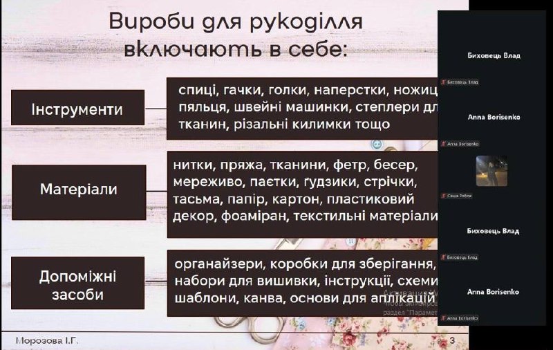 В ході лекції здобувачі ознайомились із сучасними видами творчості та рукоділля; дослідили основні асортиментні групи товарів швейної галантереї, товарів категорії DIY (do it yourself) та товарів для різних видів рукоділля; проаналізували споживні властивості даних груп товарів; ознайомилися із асортиментом онлайн-магазину «Snow Felts» – як платформи продажу виробів handmade та наборів для творчості DIY.